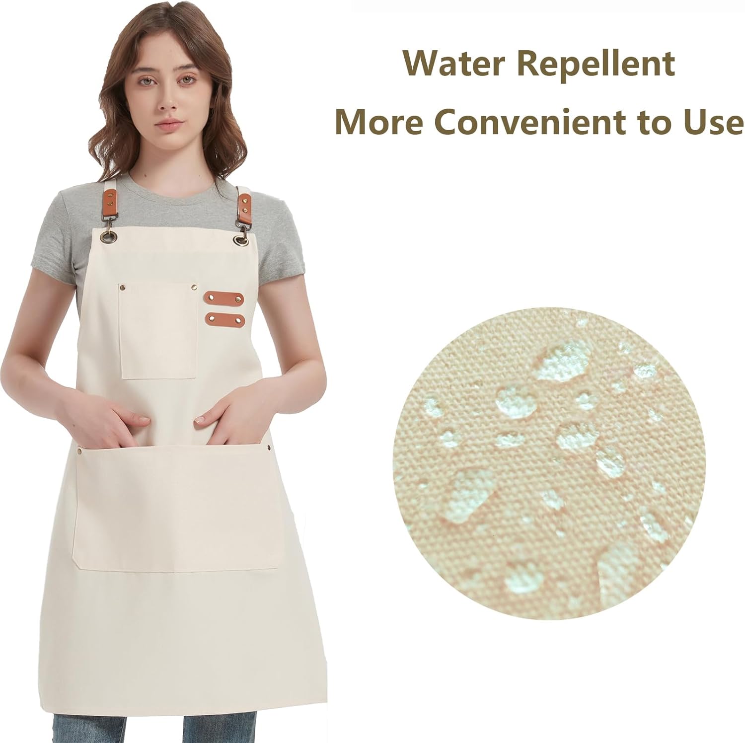 AFUN Chef Aprons for Women Men with Large Pockets, Cotton Canvas Cross Back Water Repellent Work Apron, Size M to XXL (Cream)