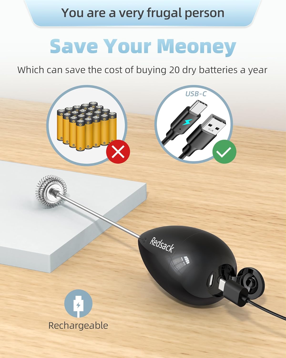 - 【You are a very frugal person】 so we use safe rechargeable batteries, which can save the cost of buying 20 dry batteries a year, and a full charge can make milk foam more than 100 times,save your meoney