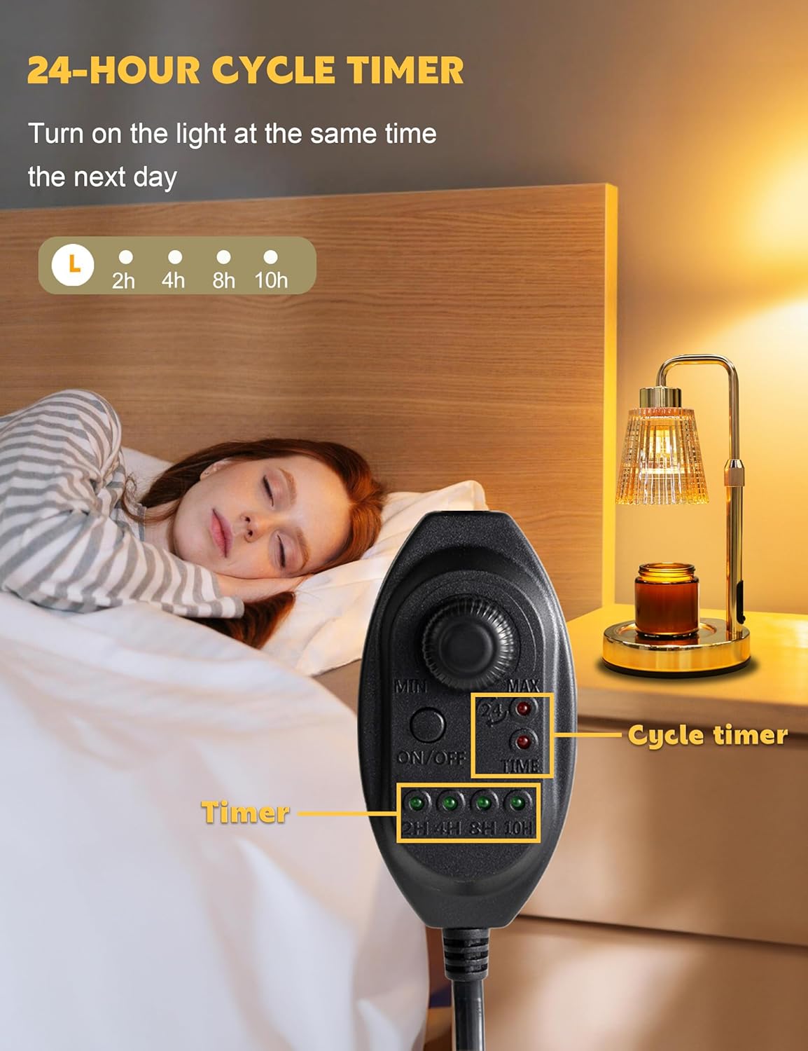 • Fully Dimmable and 12-Hour Timing Function: Enjoy complete control over the ambiance with our dimmable knob, offering unrestricted dimming for personalized melting speeds. Additionally, our Candle+Warmer+Lamp boasts a convenient timer function, ensuring a perfect atmosphere tailored to your preferences, facilitating uninterrupted sweet dreams.