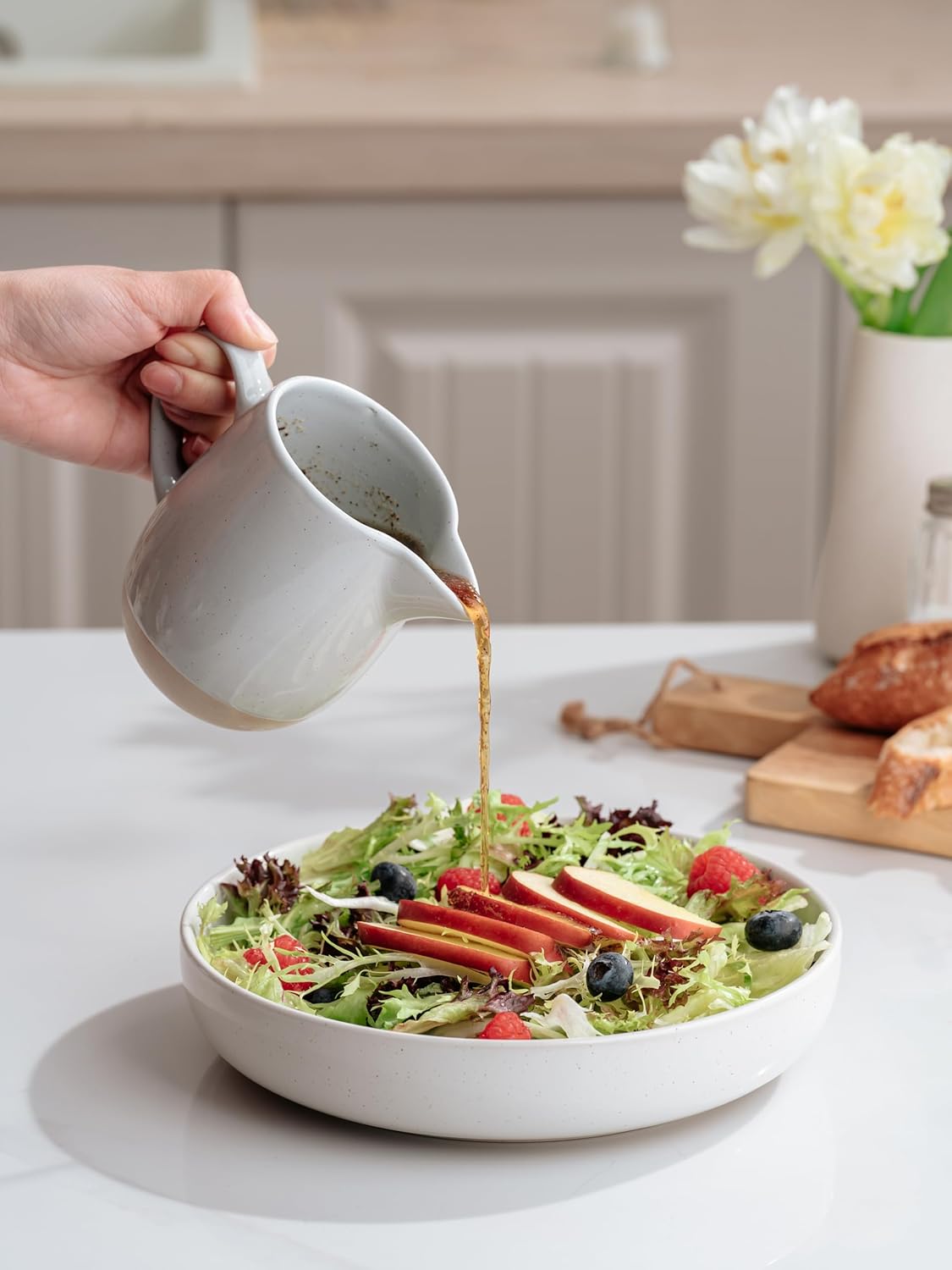 famiware Milkyway 13oz Creamer with Handle, Ceramic Coffee/Milk/Sauce/Serving/Salad Pitcher Jug, Stoneware Maple/Syrup Dispenser, Milk Frother Cup, Microwave and Dishwasher Safe, Light Gray