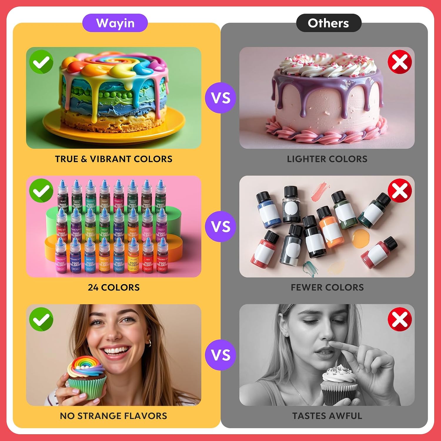 - Vibrant Neon Colors for Creative Baking:Wayin Neon 24 Food Coloring turns your baked goods into edible art! Featuring vibrant shades like electric blue, bright yellow, and bold red, it’s perfect for cupcakes, cookies, and cakes for any occasion.Wayin colors stay vivid through mixing, baking, or freezing, and blend smoothly into frosting, icing, cake drips, and buttercream flowers without altering texture.Whether for home baking or professional designs