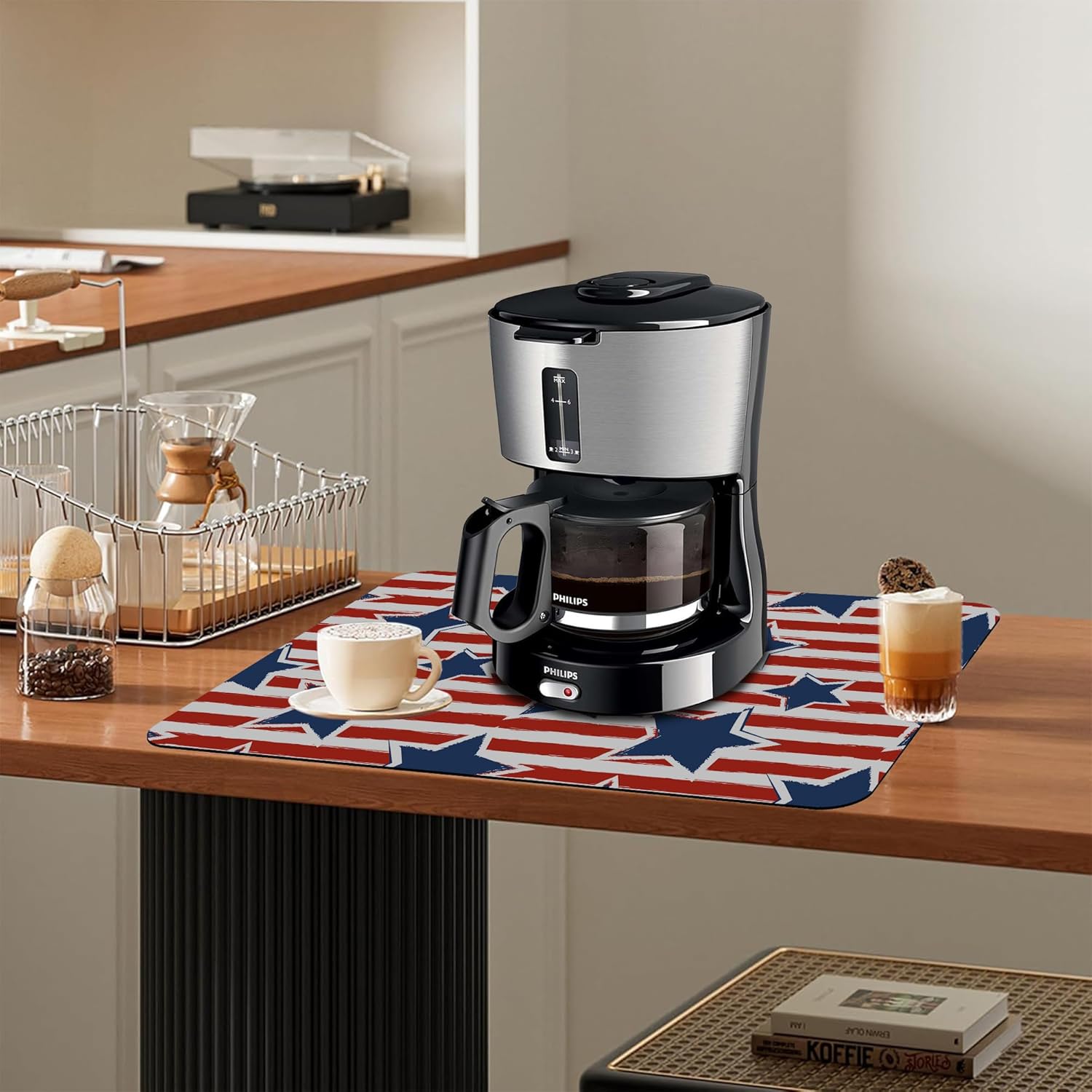 Dish Drying Mat Watercolor Blue Star Red Stripes Kitchen Mat 12"x19" Bsorbent Coffee Maker Mat for Dishes,Utensils Coffee Maker Pots and Pans Easy Clean Dish Slip Resistant Pad