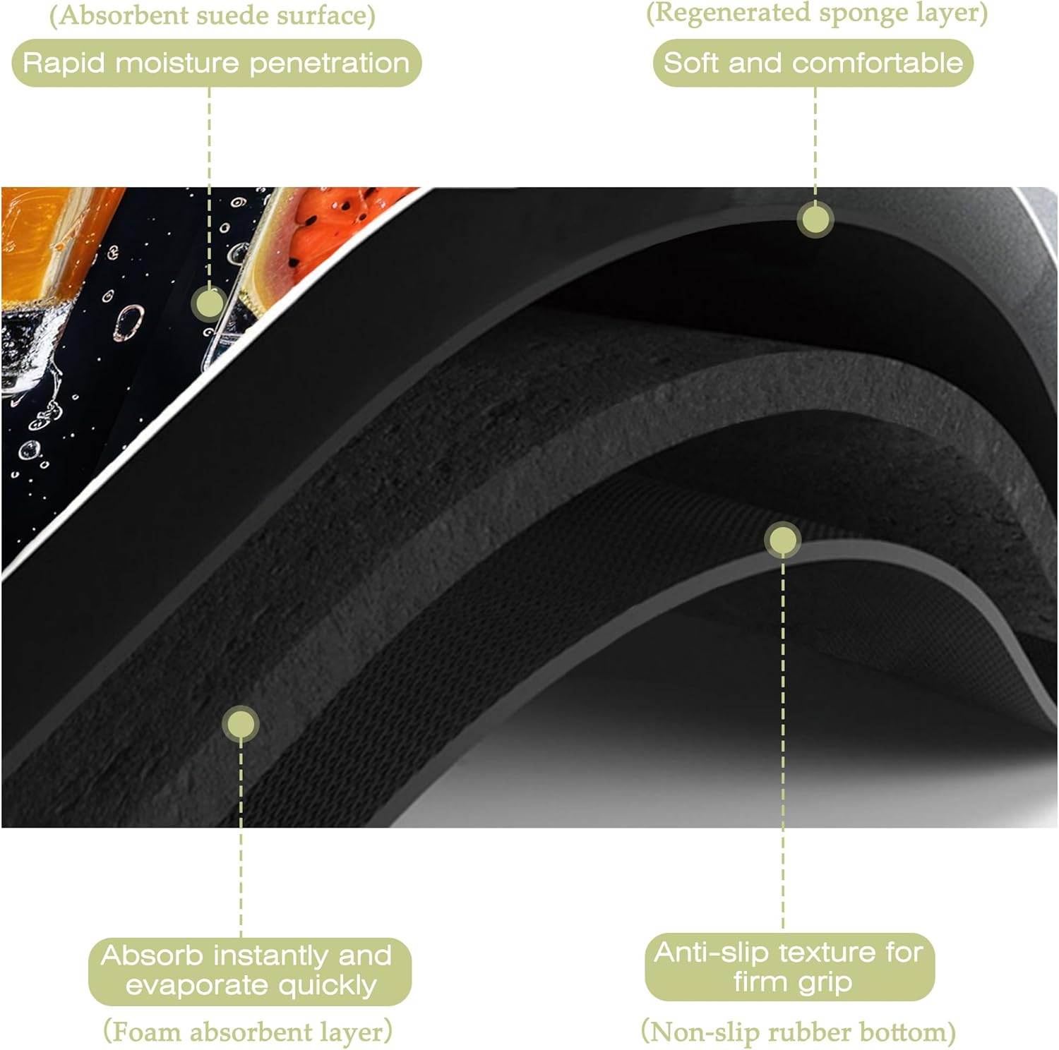 - Super absorbent and non-slip:This kitchen mat absorbent layer is made of absorbent suede and diatom mud,the surface porosity of the product is as high as 85%,which can quickly absorb water and stains,the texture design on the back is more non-slip