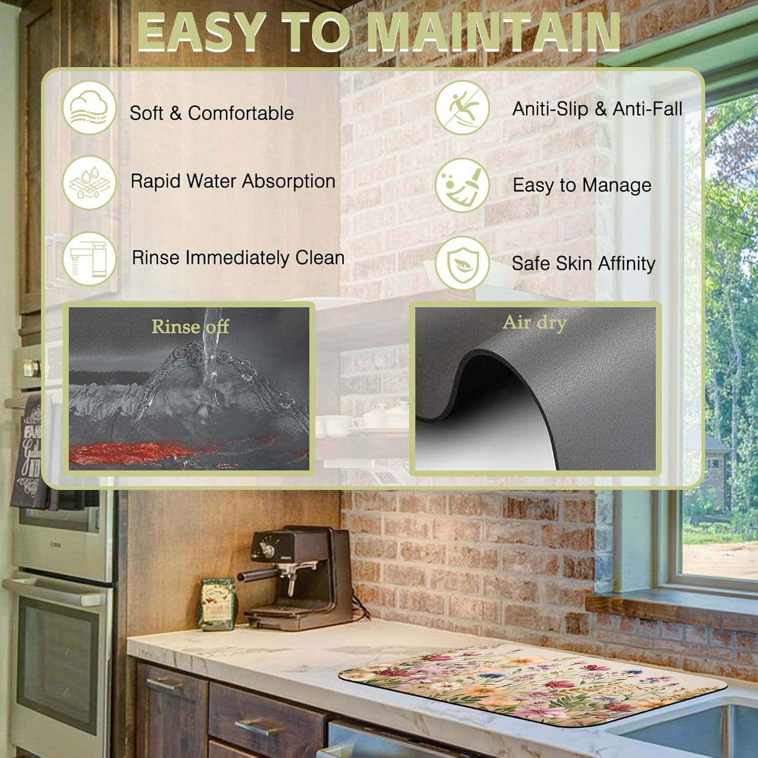 Colorful Wildflowers Dish Drying Mat Meadow Flowers Floral Kitchen Mat 16"x24" Bsorbent Coffee Maker Mat for Dishes,Utensils Coffee Maker Pots and Pans Easy Clean Dish Slip Resistant Pad