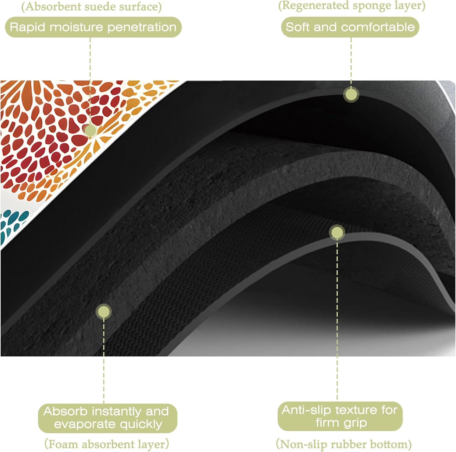 - Super absorbent and non-slip:This kitchen mat absorbent layer is made of absorbent suede and diatom mud,the surface porosity of the product is as high as 85%,which can quickly absorb water and stains,the texture design on the back is more non-slip