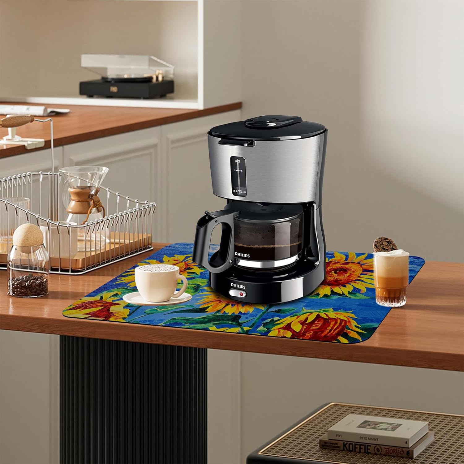Kitchen Mat Oil Painting Sunflowers Dish Drying Mat 16"x24" Bsorbent Coffee Maker Mat for Sink Dishes or Under Rack Kitchen Counter Accessories Absorbent Hide Stain Rubber Backed Dish Drying Pad