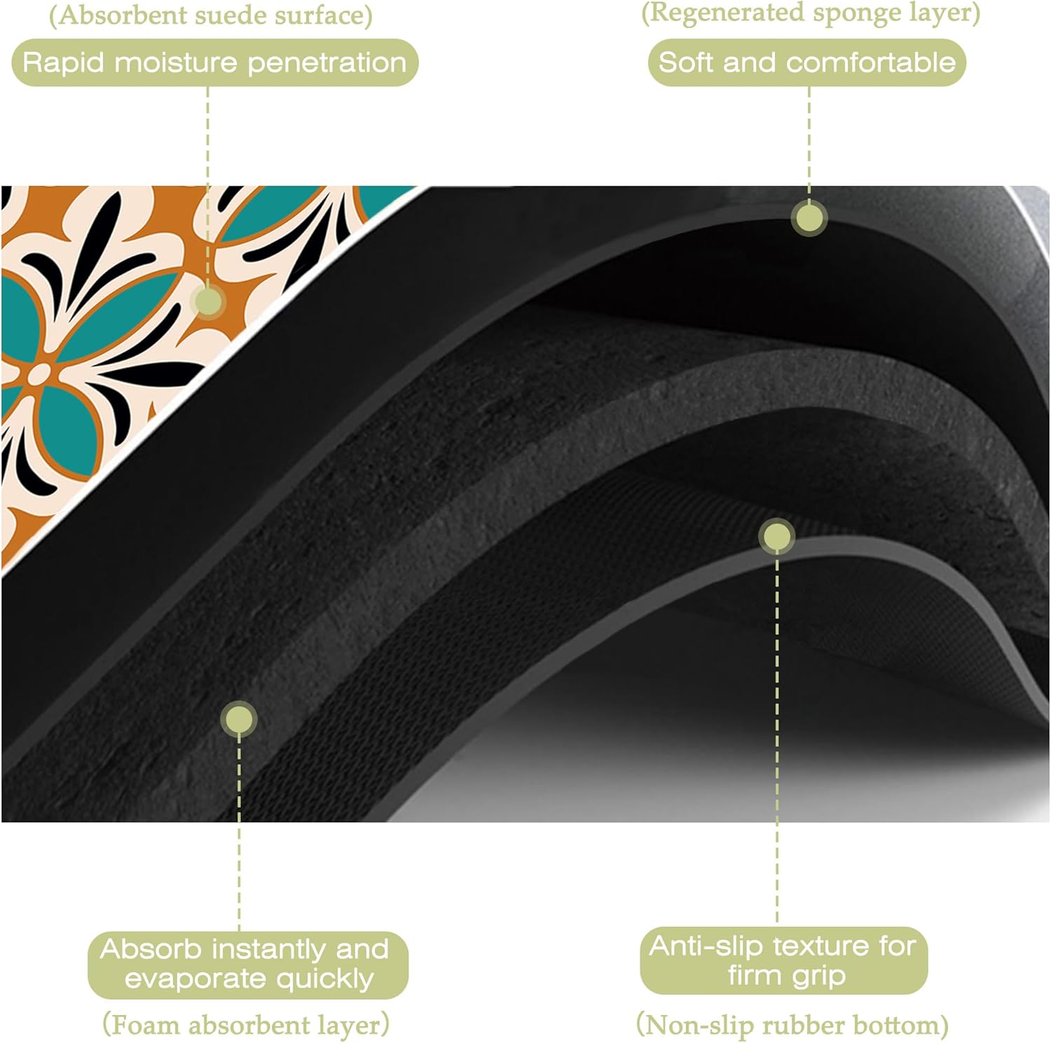 - Super absorbent and non-slip:This kitchen mat absorbent layer is made of absorbent suede and diatom mud,the surface porosity of the product is as high as 85%,which can quickly absorb water and stains,the texture design on the back is more non-slip
