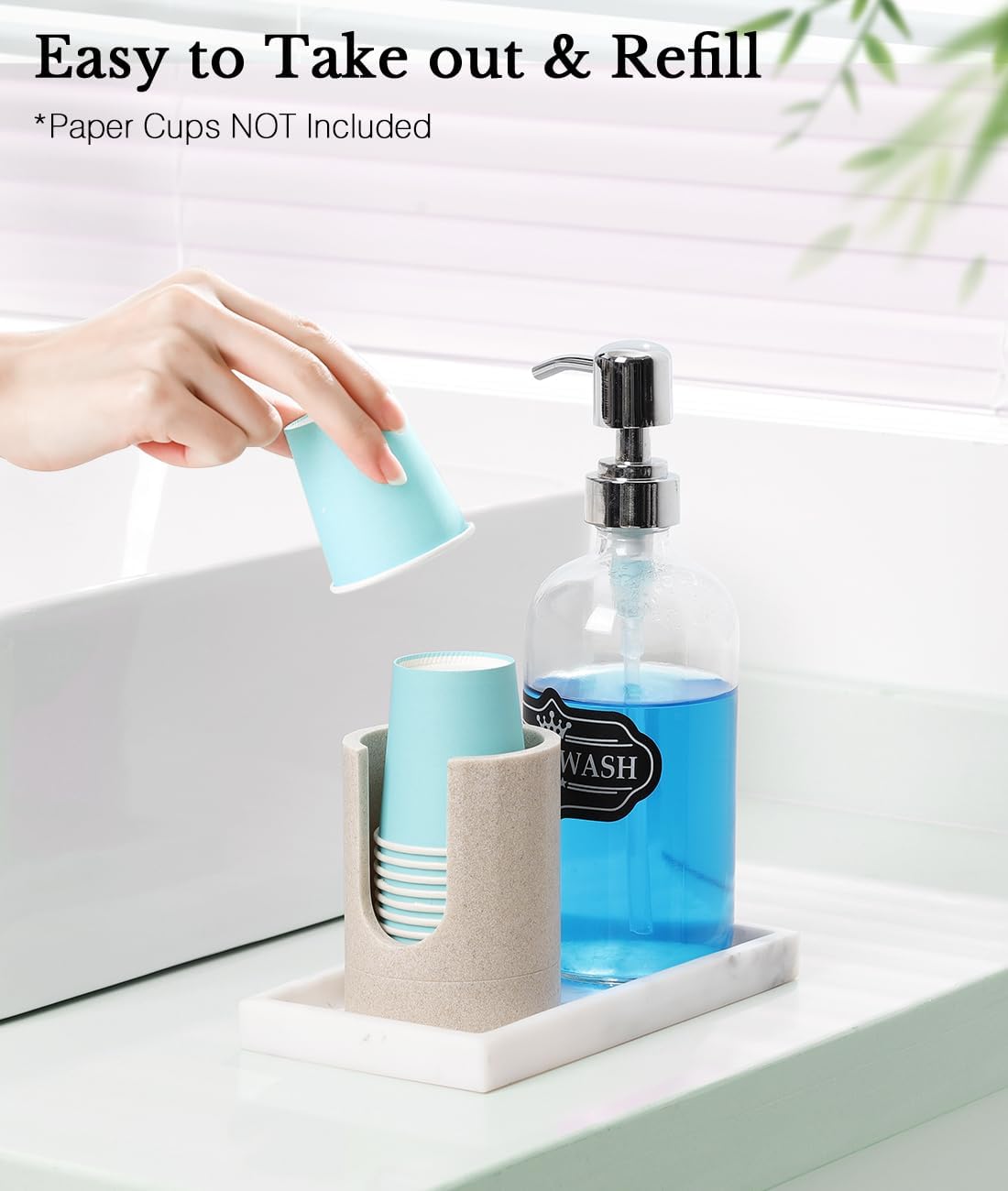 - Practical Details: The U-shape front and open top provide clear visibility for easy access and restocking. The matte texture plus stripe on the bathroom cup holder surface ensure secure holding without dropping. Stick non-slip pads on the bottom, preventing the mouthwash cup dispenser from sliding around and scratching your countertop.
