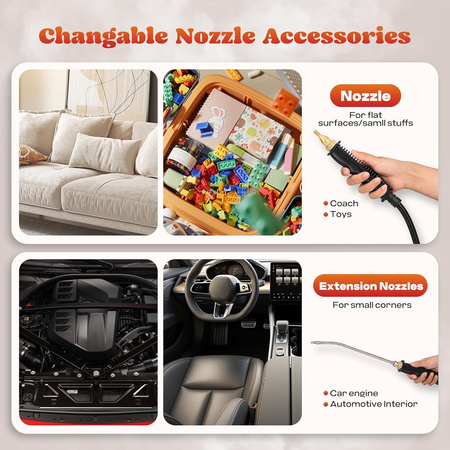 - 【For Multi Surfaces】Our steam cleaner for all surfaces not only cleaning stains on kitchens, bathrooms, floors, carpets, but also for car detailing, which will save you more car wash costs! With 3 different brush heads, this steam cleaner for funiture is also suitable for cleaning various stuffs such as stoves, walls, sofa, etc