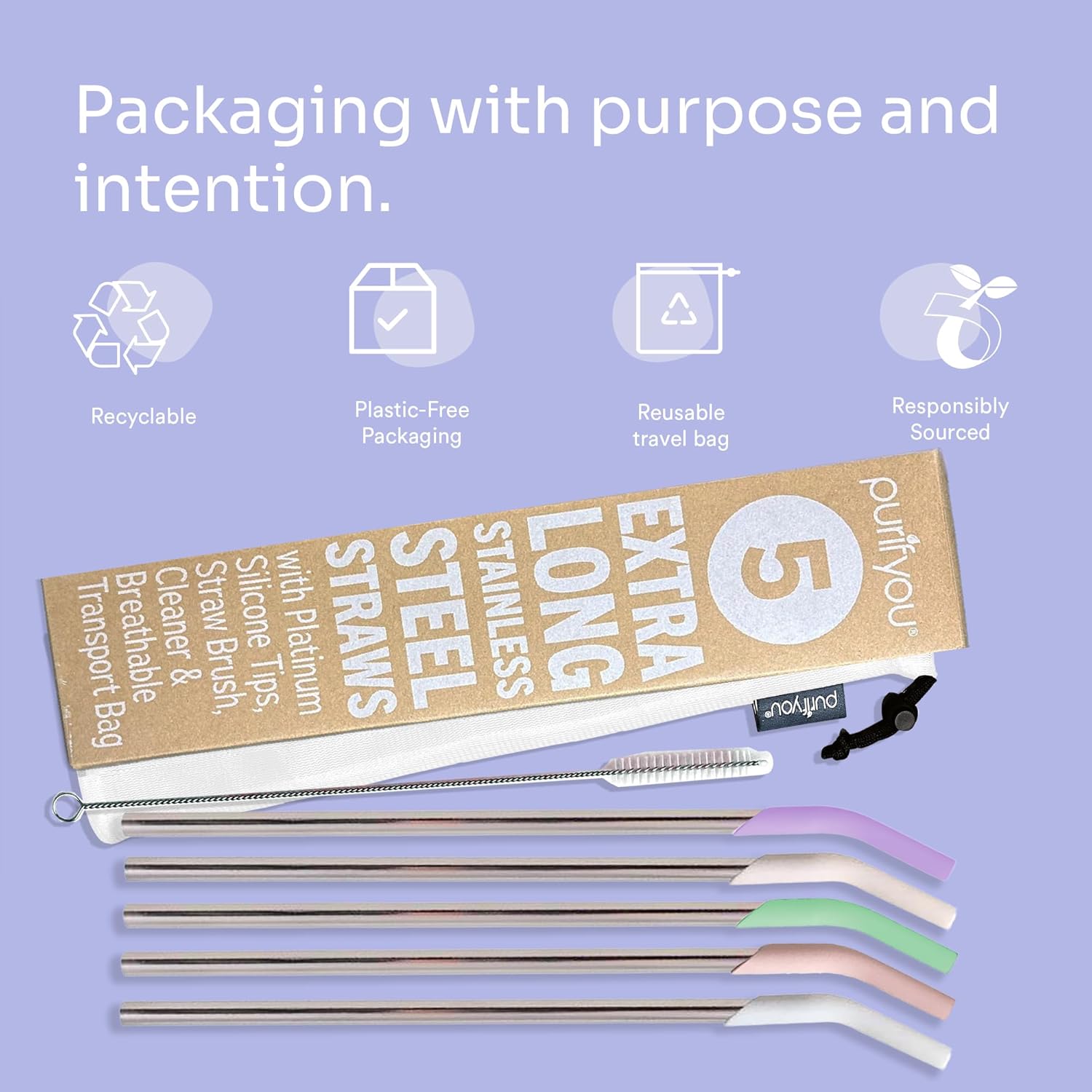 - Complete pastel set includes 5 stainless steel straws, 5 pastel silicone tips, cleaning brush, and travel bag. BPA-free, dishwasher-safe, and eco-friendly.