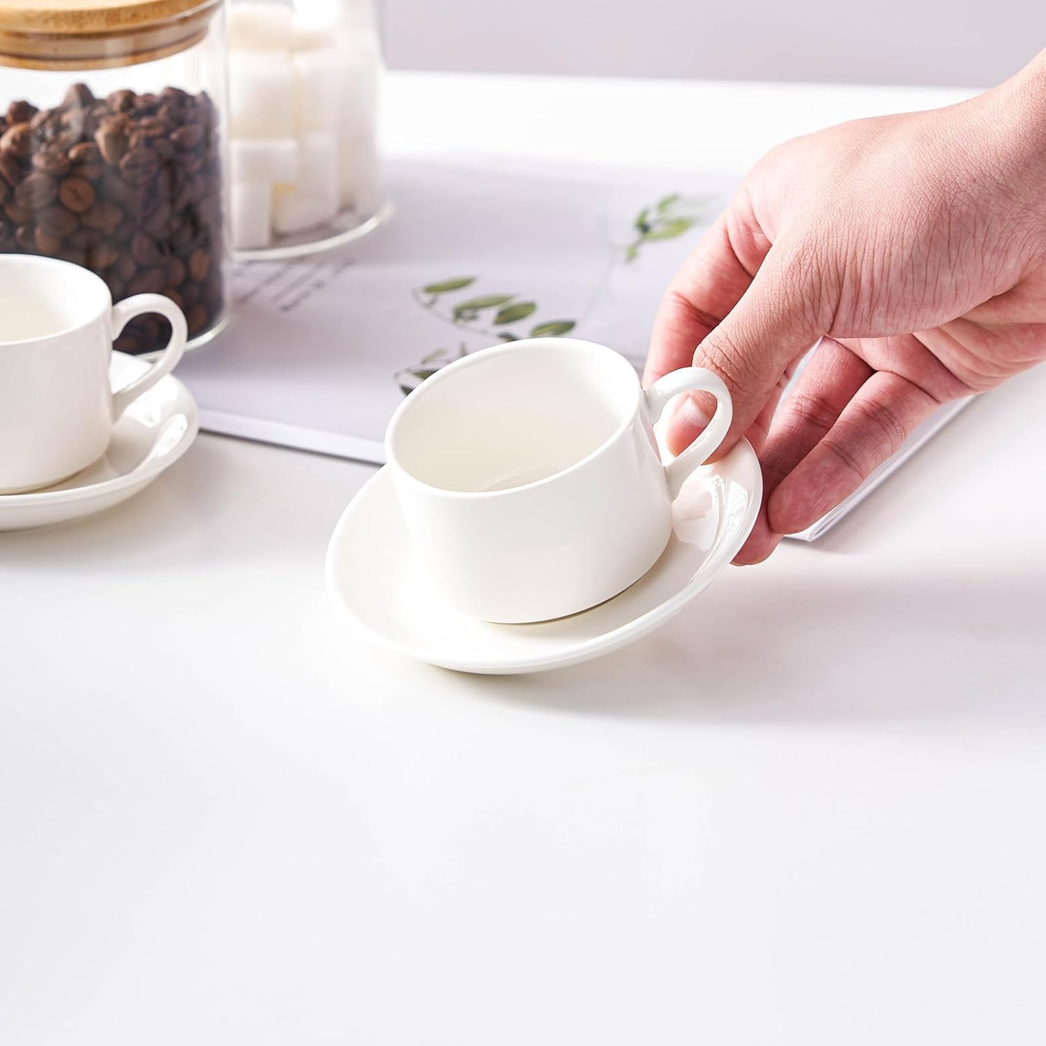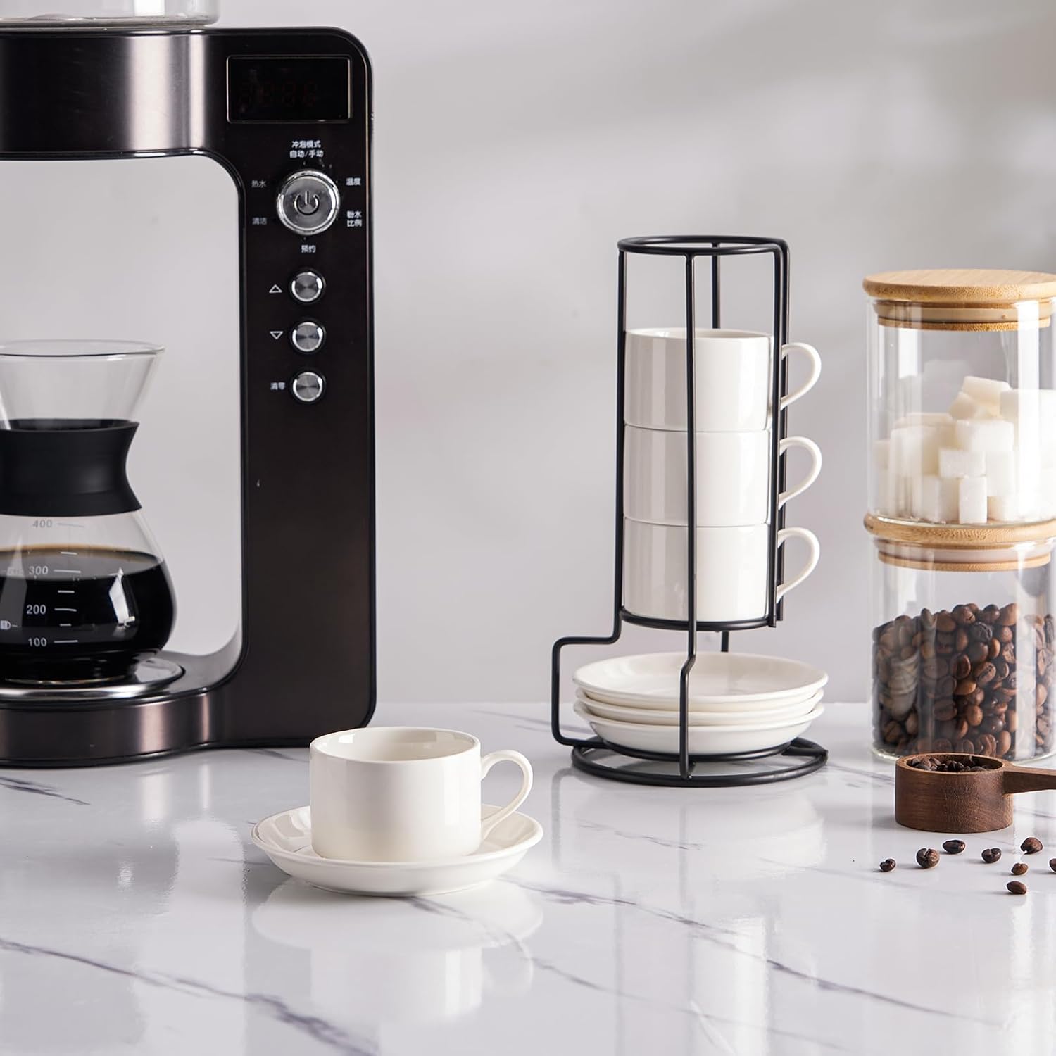 - 1. Elevate your kitchen experience with the MEICHU Espresso Cups Set. This set includes 4pcs 2.5 Ounce Espresso Cups with Saucers and Metal Stand, all in a classic ceramic white color. Perfect for people who enjoy coffee and conversation!