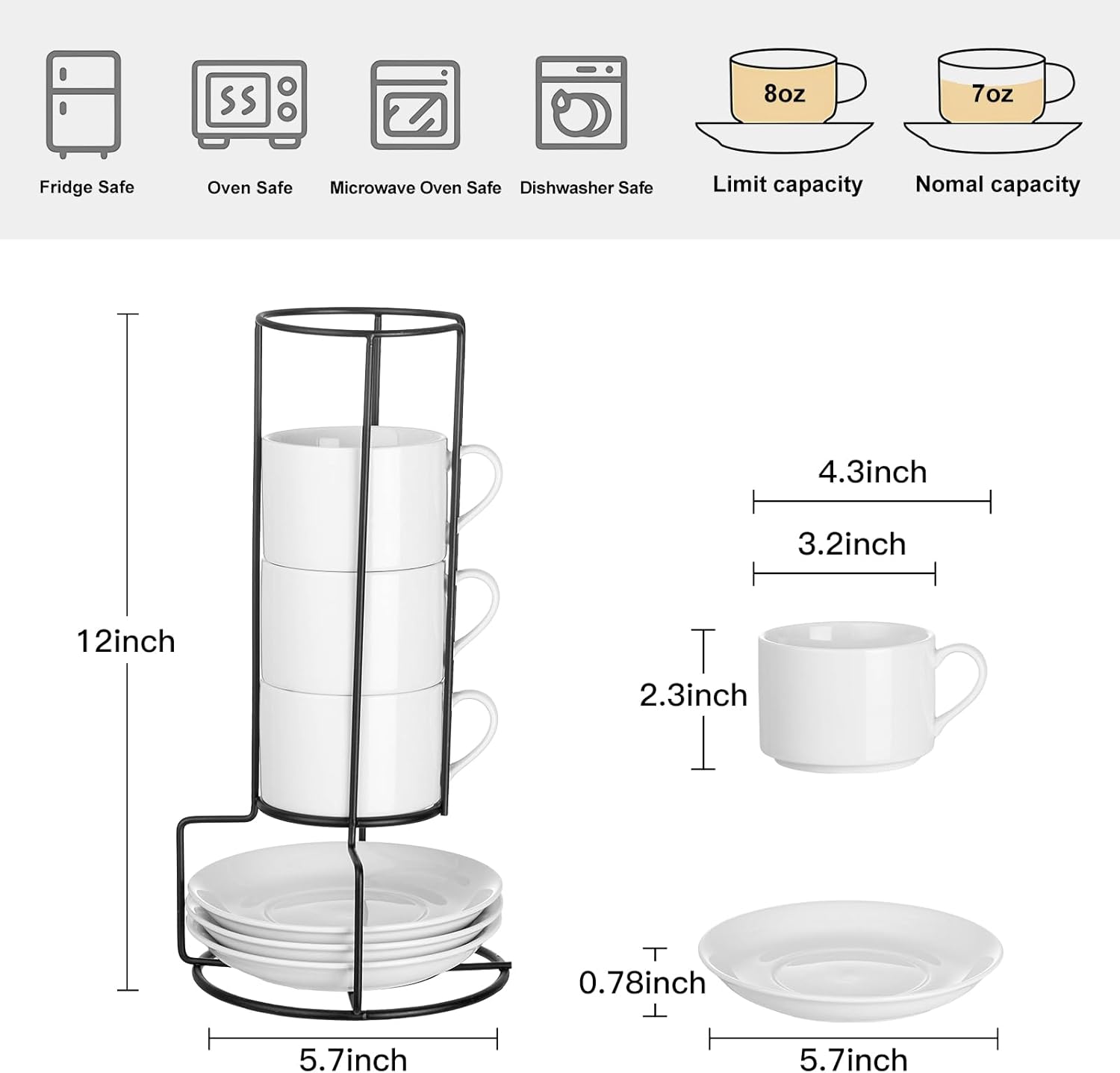 8oz Porcelain Stackable Cappuccino Cups with Saucers and Metal Stand Set of 4, Coffee Cups for Espresso, Specialty Coffee Drinks, Latte, Americano and Tea - White