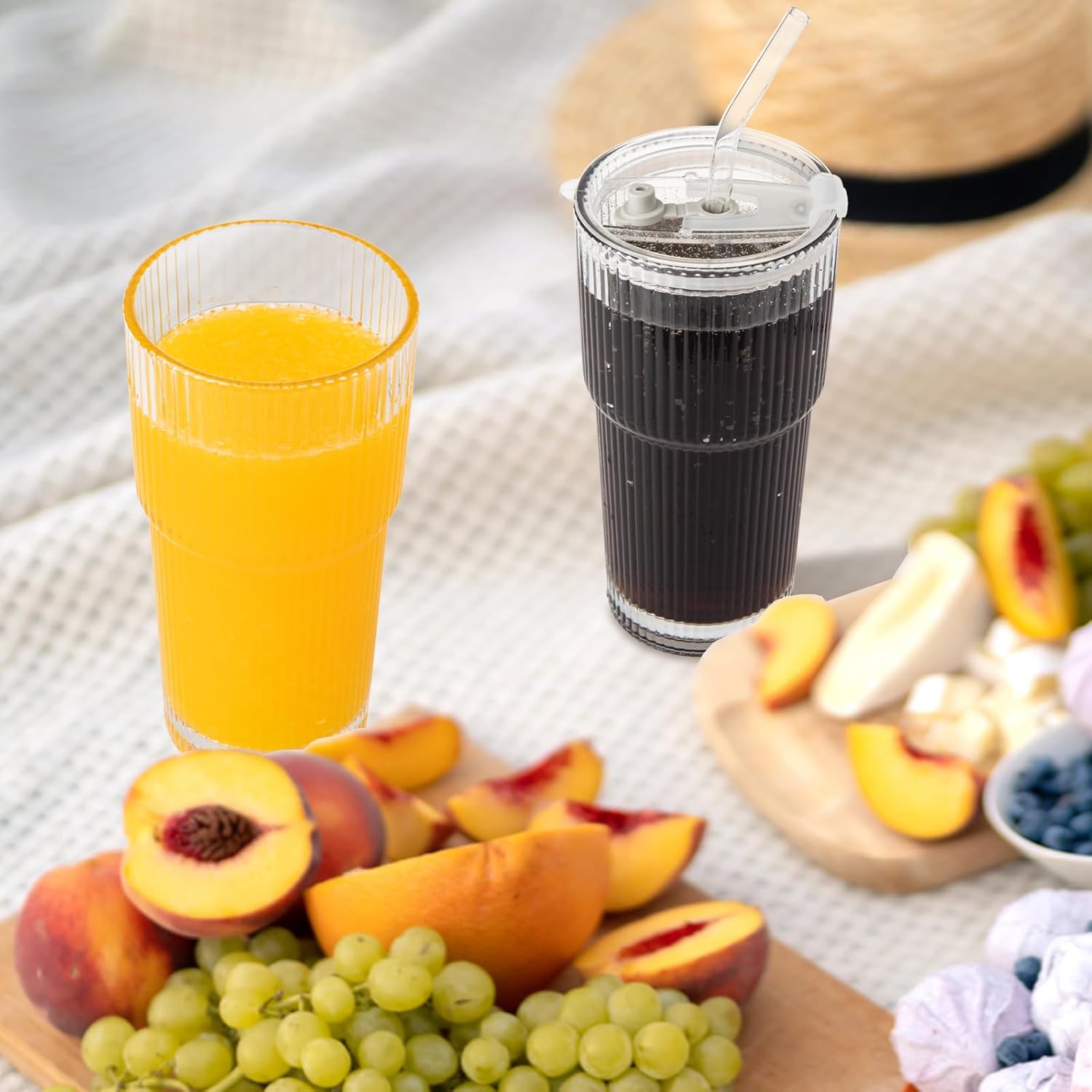 20oz Ribbed Glass Cups with Lids and Straws 2 Set, Vintage Glassware for Whiskey Cocktail Beer, Glass Tumbler, Iced Coffee Cups For Cold Drinks, Smoothie, Juice,Drinking (6)