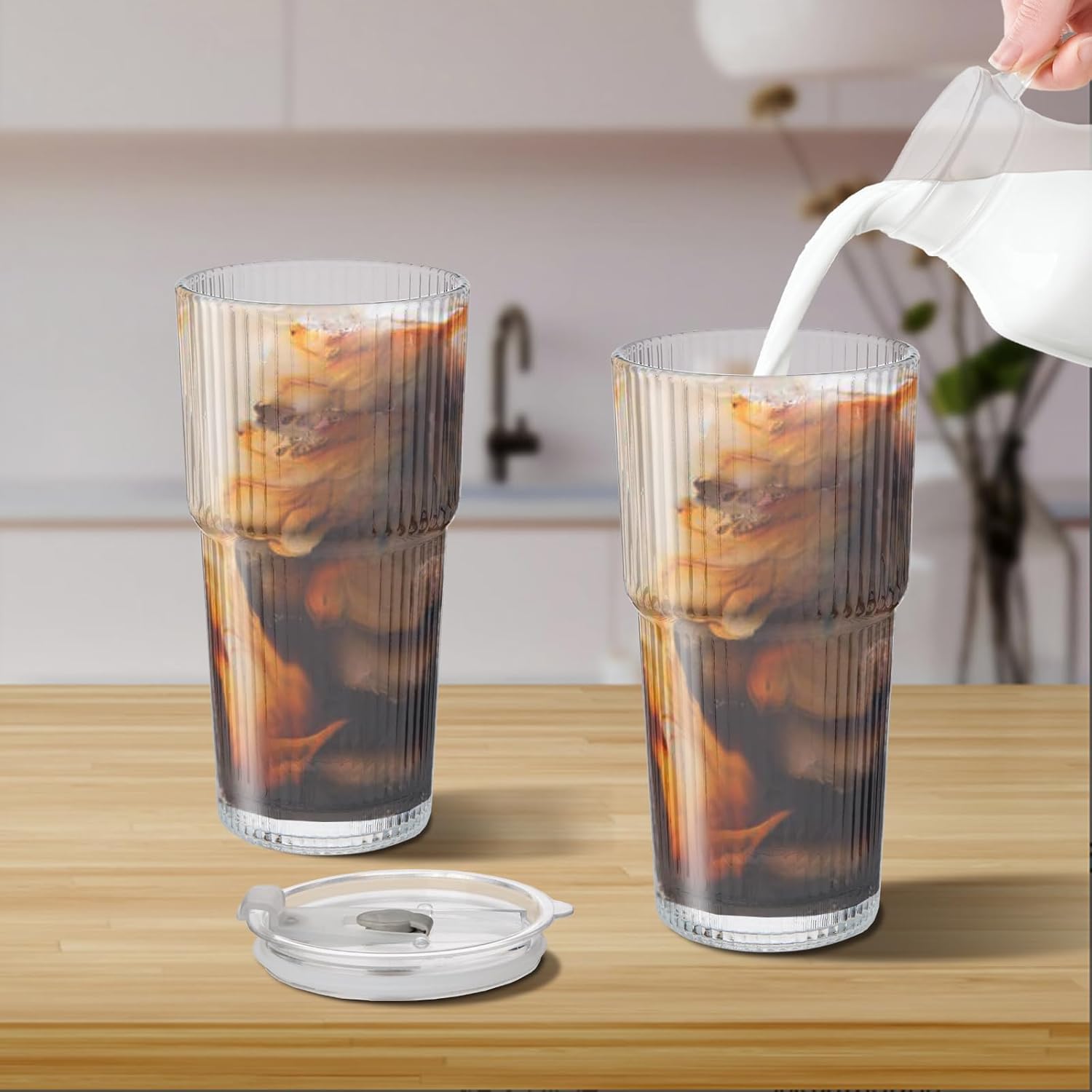 20oz Ribbed Glass Cups with Lids and Straws 4 Set, Vintage Glassware for Whiskey Cocktail Beer, Glass Tumbler, Iced Coffee Cups For Cold Drinks, Smoothie, Juice,Drinking (4)