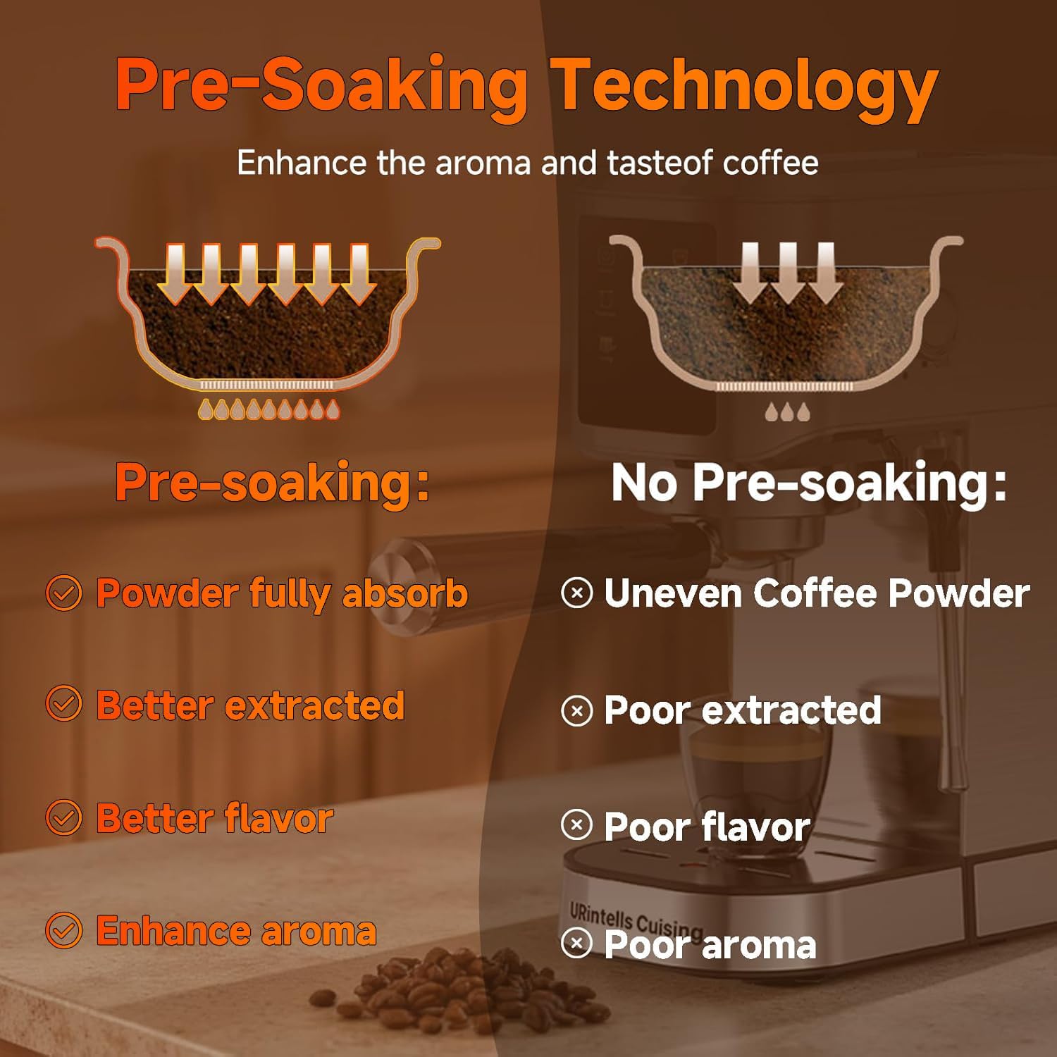 - 20 Bar Professional High Pressure & Pre-Soak Tech: Our coffee machine with 20 bar professional pump and 1350 W powerful fast heating system, this latte machine gives you top quality extraction, resulting in a more fragrant and rich aroma. Pre soak technology of our latte coffee machine allows coffee lovers to avoid the trouble of adding hot water into the ground coffee in advance, and make coffee extraction more uniform and taste more mellow