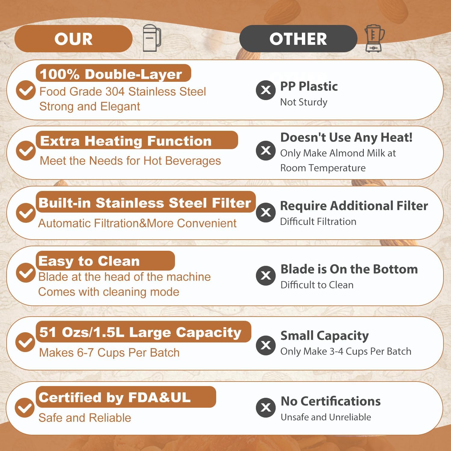 - Generous 1.2L/50oz Capacity: No more running to the store for overpriced milk! With a substantial capacity of 1.2 liters (50 ounces), our almond milk maker lets you produce up to 6-7 cups of your favorite nut milk in a single batch. Whether you crave a warm drink on a chilly morning or a chilled beverage on a hot day, this powerful machine meets all your needs with ease. It's perfect for busy mornings, allowing you to enjoy fresh, homemade nut milk that’s not only cost-effective but also environmentally friendly.