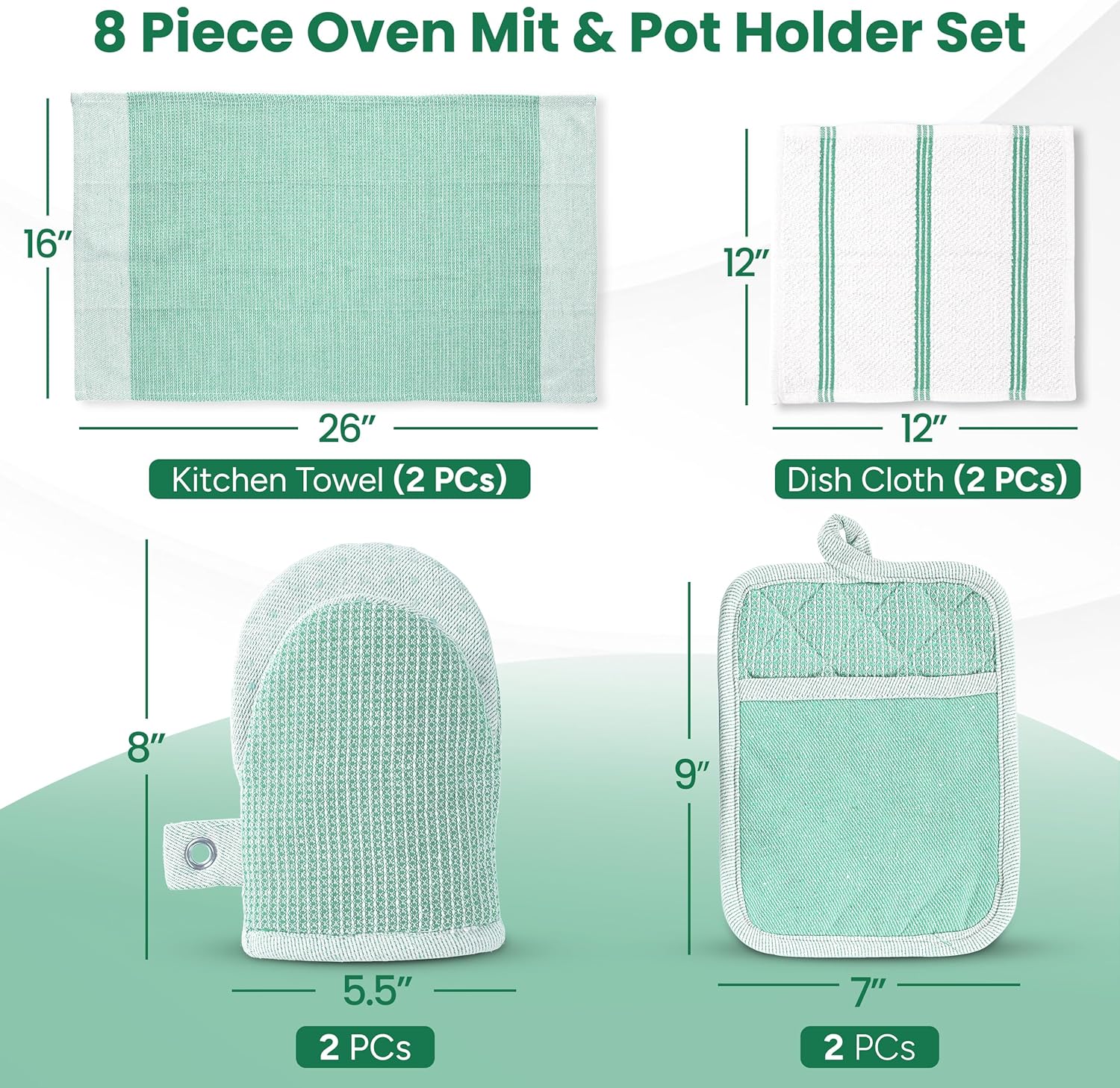 - 8-PIECE KITCHEN ESSENTIALS – ALL-IN-ONE SET – This set includes 2 kitchen towels (16"x26"), 2 terry cloth dish towels (13"x13"), 2 heat-resistant gloves for cooking (5.5"x8"), and 2 silicone pot holders (7"x8"). Designed for daily use, these potholders for kitchens are durable, stylish, and perfect for any home or RV.