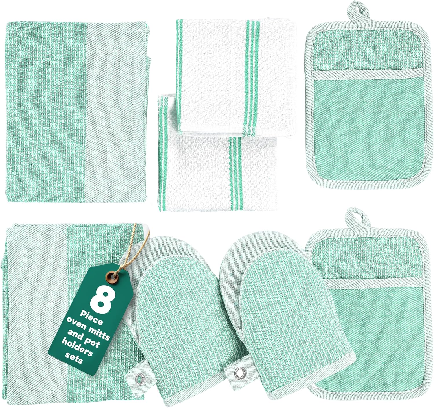 Casa Platino Potholders & Oven Mitts Heat Resistant, 8-Piece Mini Oven Mitts with Silicone Grip, Potholders for Kitchens, 2 Kitchen Towels & 2 Dish Cloths – Durable & Non-Slip – Sage