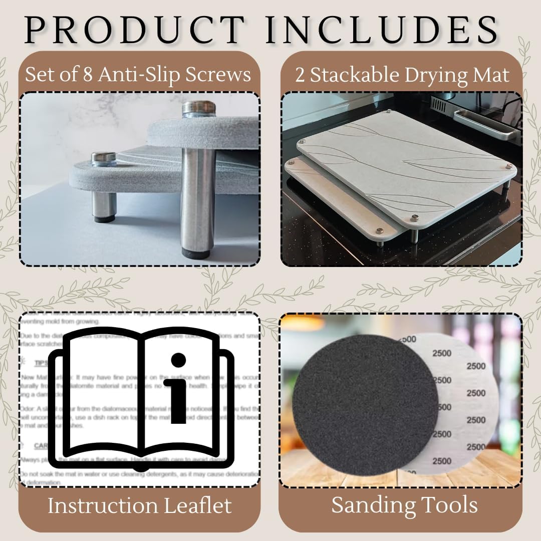 - ✅ Super Absorbent & Fast Drying : Say goodbye to soggy towels and cluttered sink areas. Our diatomaceous earth drying mat instantly absorbs water and dries within minutes—keeping your countertop clean and dry at all times.