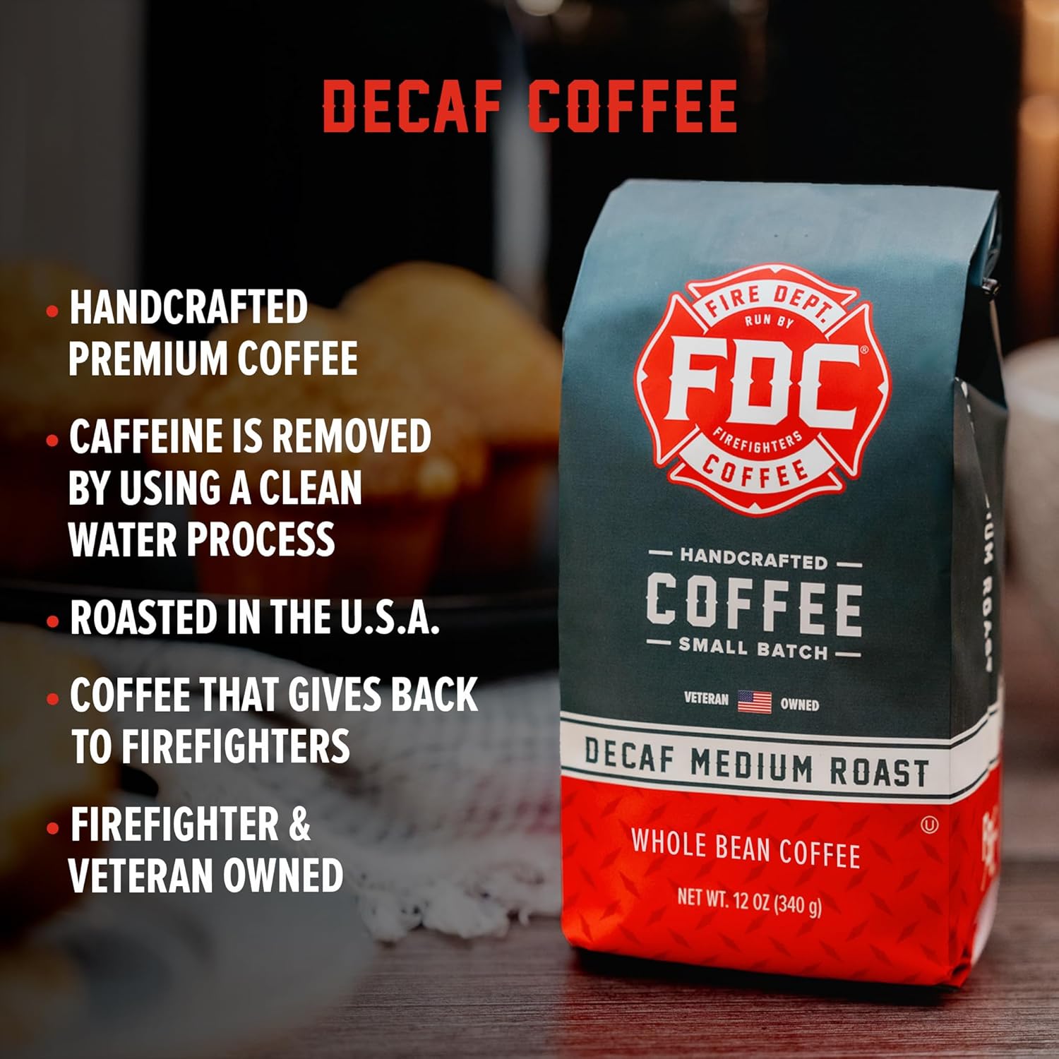 Fire Department Coffee - Gives Back to Firefighters - Premium Whole Bean Decaf Coffee - Roasted in the USA - Decaffeinated Using Natural Mountain Water - Veteran Owned -12 oz