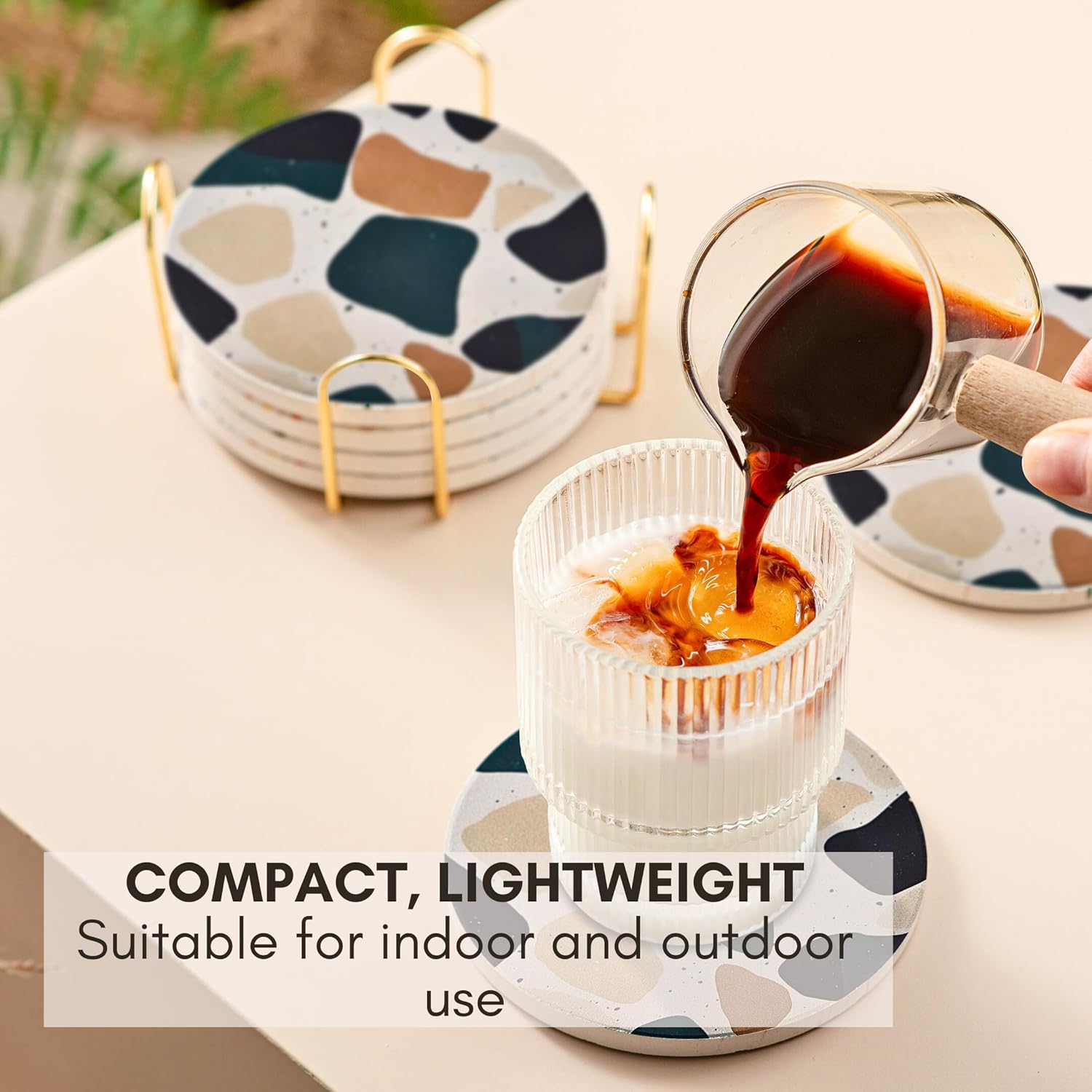 - Minimalism & Elegance: This coasters with holder comes with a gold metal holder for easy storage and 6 marble drink coaster to suit all centerpiece table decor. Our water absorbing coasters are available in green, black, navy blue, white coasters.