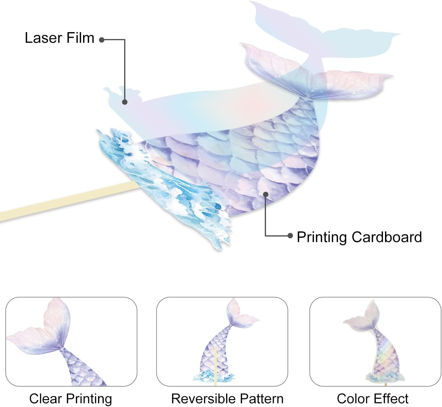 - High Quality Material: Mermaid tail cupcake toppers is made of high quality thick card stock and food grade bamboo stick, durable and sturdy, not easy to deform or break, lightweight and portable, attractive and durable