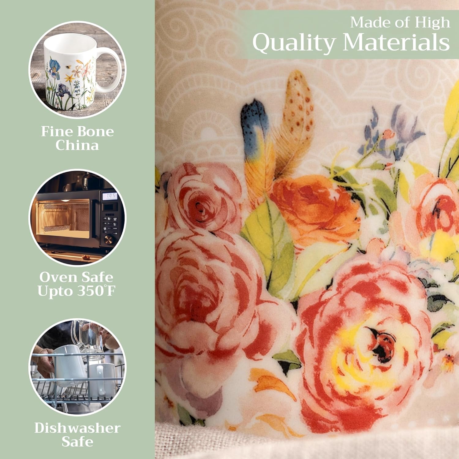 - Easy Care & Maintenance: Microwave, dishwasher, and oven safe up to 350°F. These bone china mugs are built for convenience and durability, making cleanup and reheating simple without compromising on quality