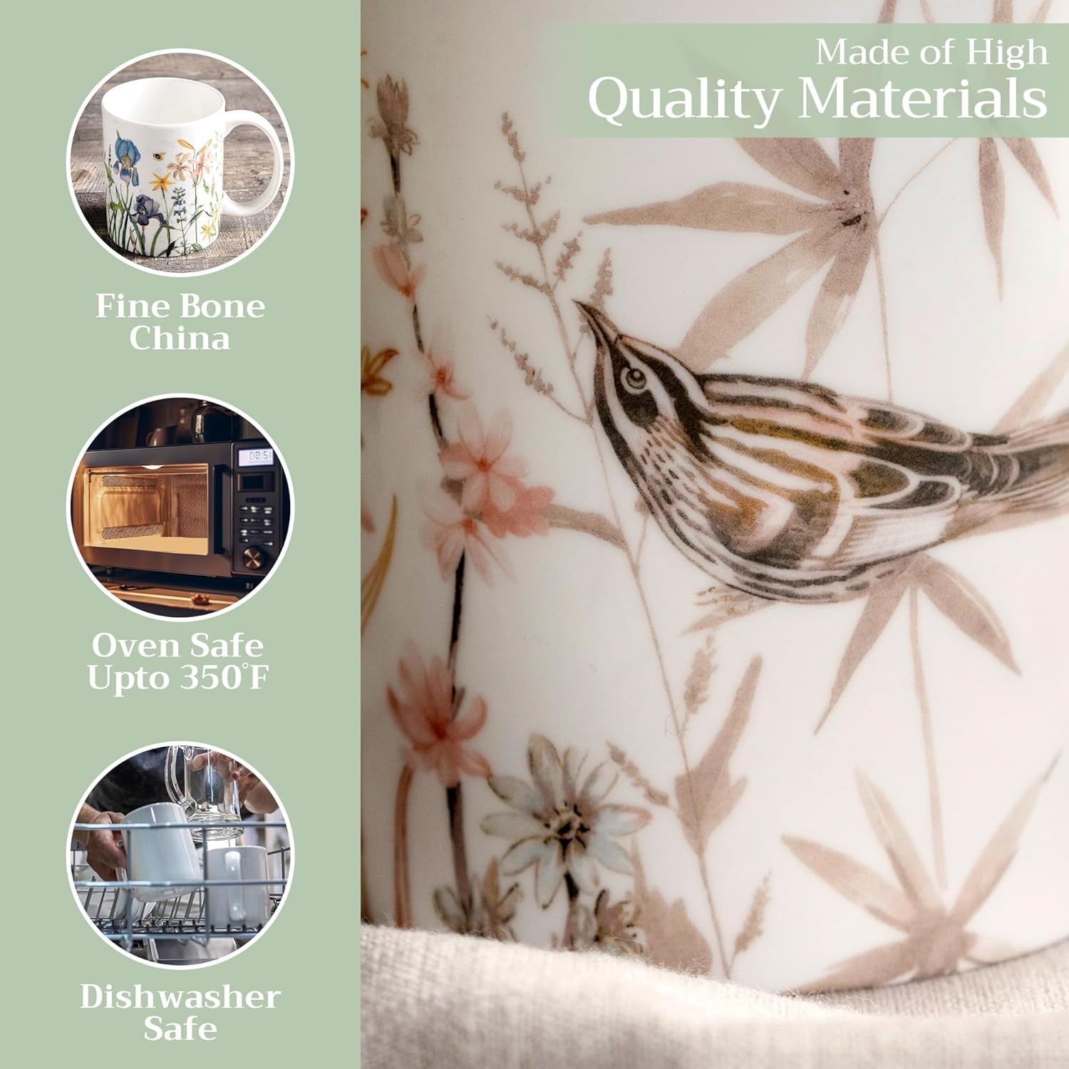 - Easy Care & Maintenance: Microwave, dishwasher, and oven safe up to 350°F. These bone china mugs are built for convenience and durability, making cleanup and reheating simple without compromising on quality