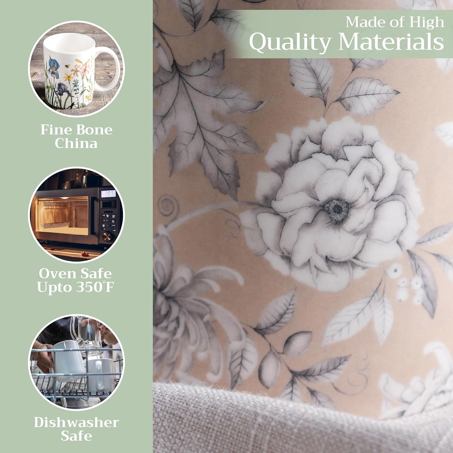 - Easy Care & Maintenance: Microwave, dishwasher, and oven safe up to 350°F. These bone china mugs are built for convenience and durability, making cleanup and reheating simple without compromising on quality