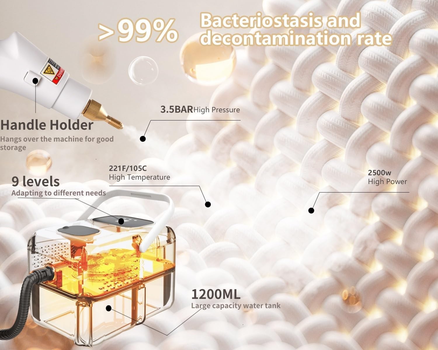 - Powerful High Pressure Steam Cleaner - Foandbevi steam cleaner handheld features 2500W power, quickly generating steam up to 221℉(105℃) 3.5 Bar in 15s. No need to wait to deeply clean and eliminate grease, grime, dust, and stains from all surfaces