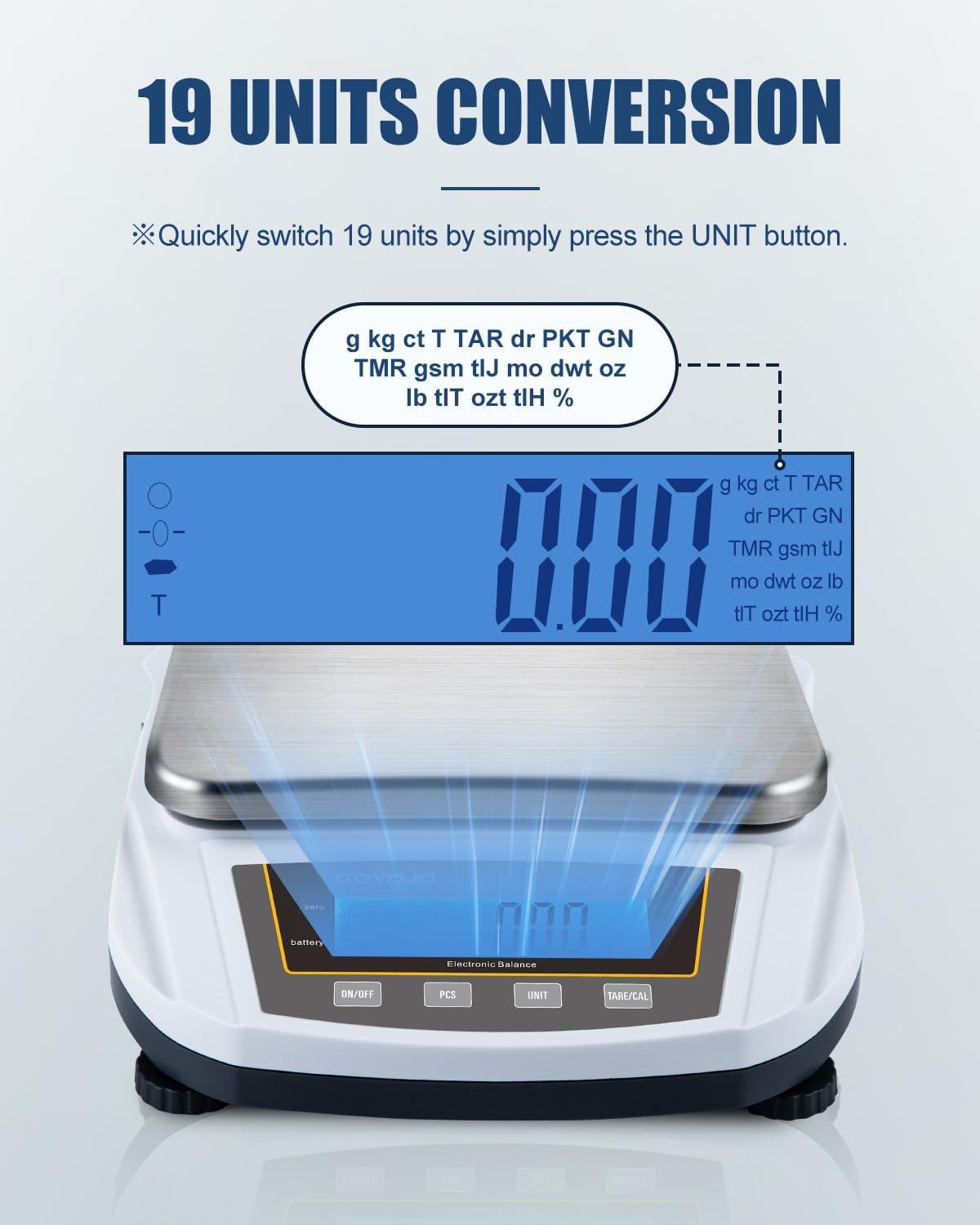 GOYOJO Digital Analytical Balance and Lab Scale, 5000g Capacity, 0.01g Precision, Stainless Steel, Multi-Unit (g/oz/ct/lb) for Jewelry, Kitchen, and Lab – Reliable, Accurate, Easy to Use, Black Panel