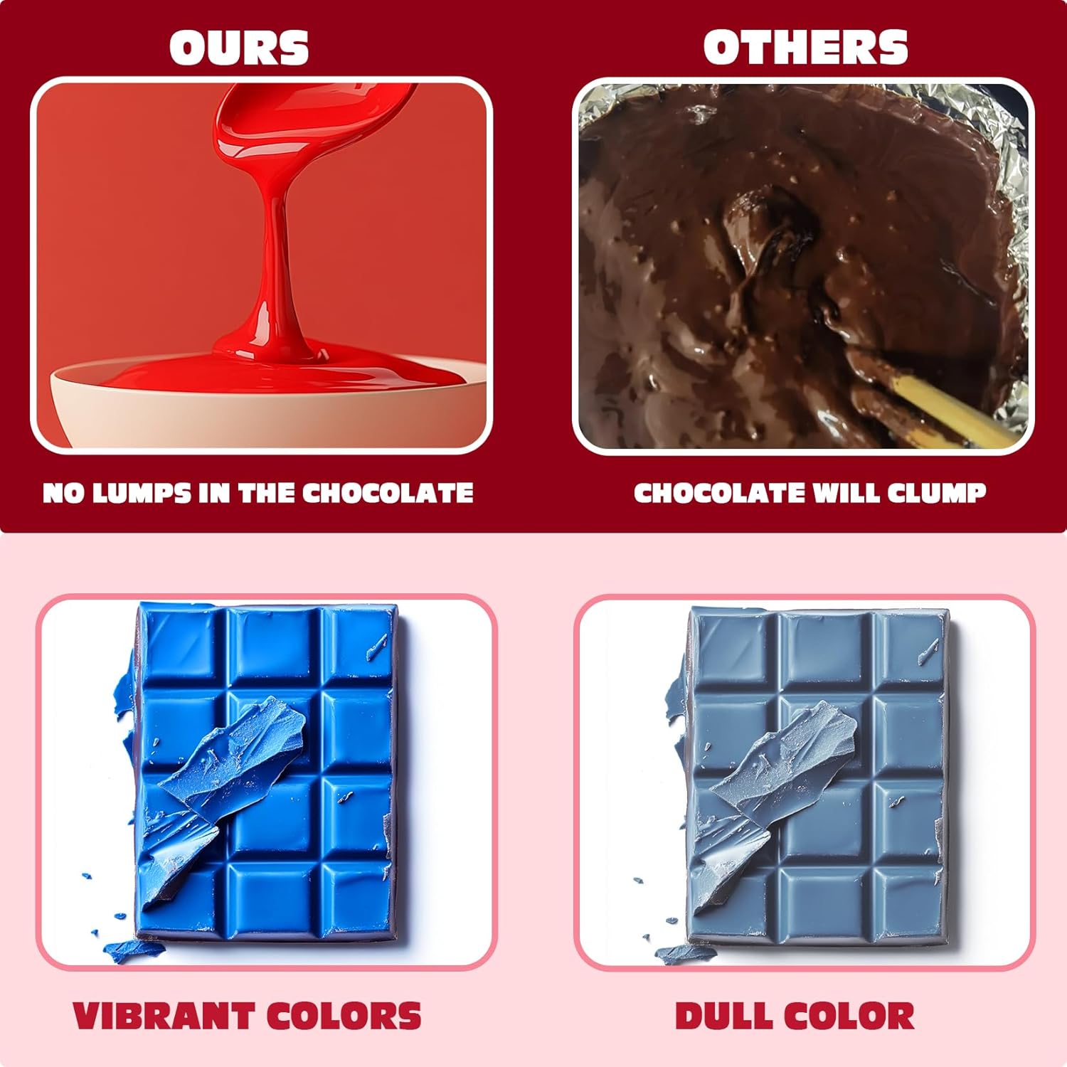 - Oil based Food Coloring: Compared to liquid or gel food coloring, oil based food coloring is designed to blend perfectly with high-fat foods like chocolate, candy and cream. It won't cause your chocolate to harden or clump, ensuring a smooth and seamless integration. Create stunning works of chocolate art with ease.