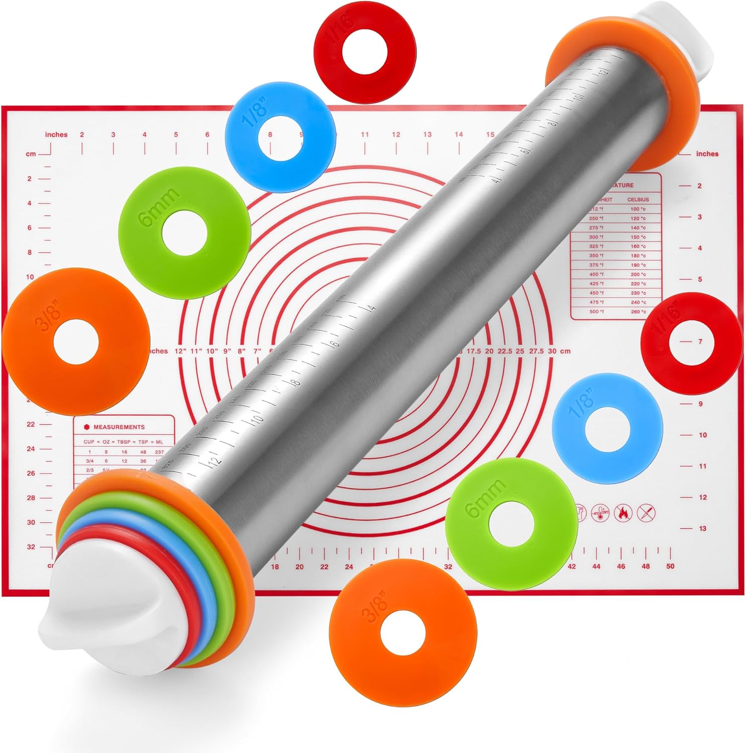 Adjustable Stainless Steel Rolling Pin with 4 Dough Thickness Rings & Non-Stick Red Pastry Mat – 17" Professional Tool for Baking Pizza, Pasta, Cookies & Pie Crusts