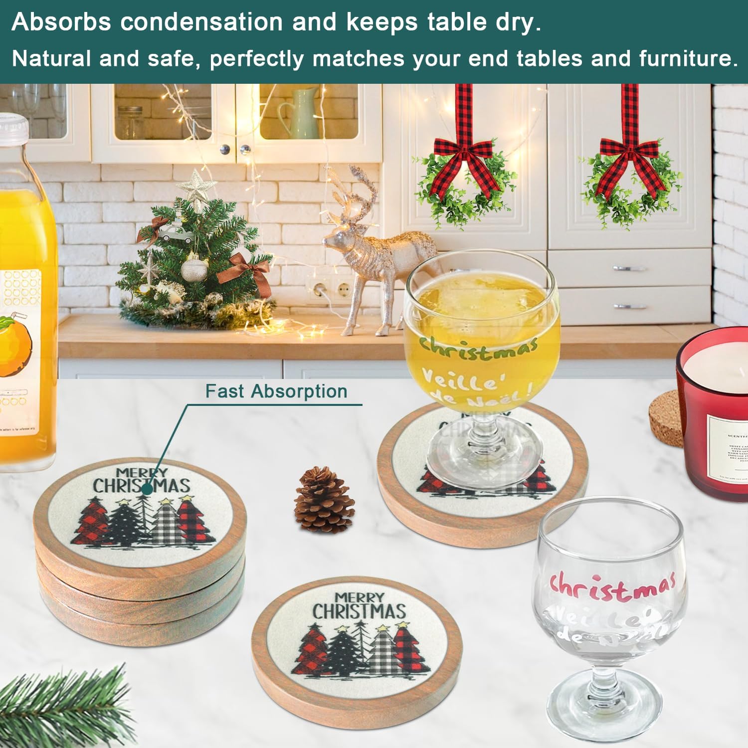 - 🎁Super Absorbent Coasters: Cup coasters with built-in thickened felt pads for stronger water absorption and heat insulation, capture liquids quickly were prevent any spills, keeping your tabletop clean and tidy, with no stains and water rings; extra large size easily accommodates cups of all sizes.