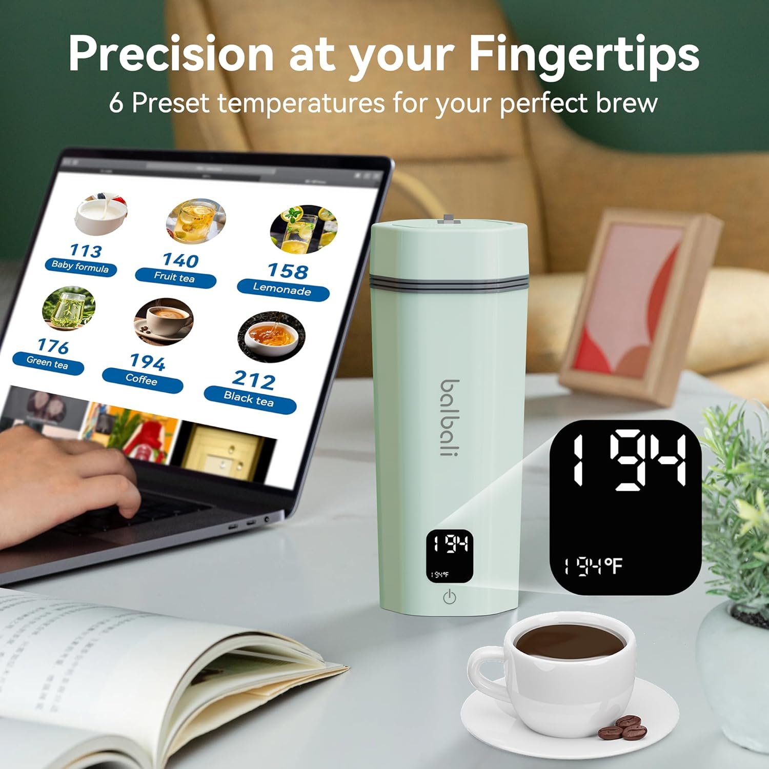 balbali Portable Tea Kettle for Travel 100-240V Dual Voltage - 6 Preset Electric Portable Water Heater for Boiling - Self Heating Cup/Thermos - 12oz Hot Water Boiler/Heater/Warmer - Green