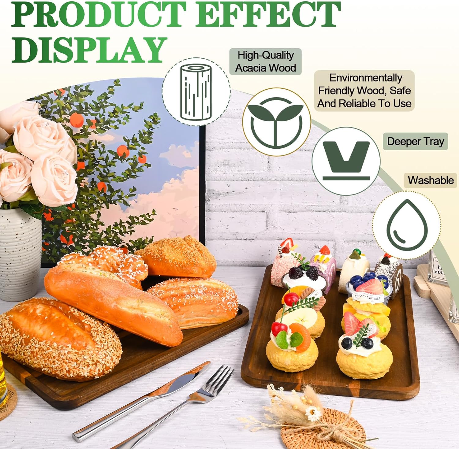 - NATURAL ACACIA WOOD: This wooden serving platter is made of food-grade acacia wood, does not contain BPA, PVC or toxic finishes. Purely handmade, the surface of the rectangle wood tray retains the original color and grain of the wood, is wear-resistant. It can be used not only as kitchen trays but also as home decorations.
