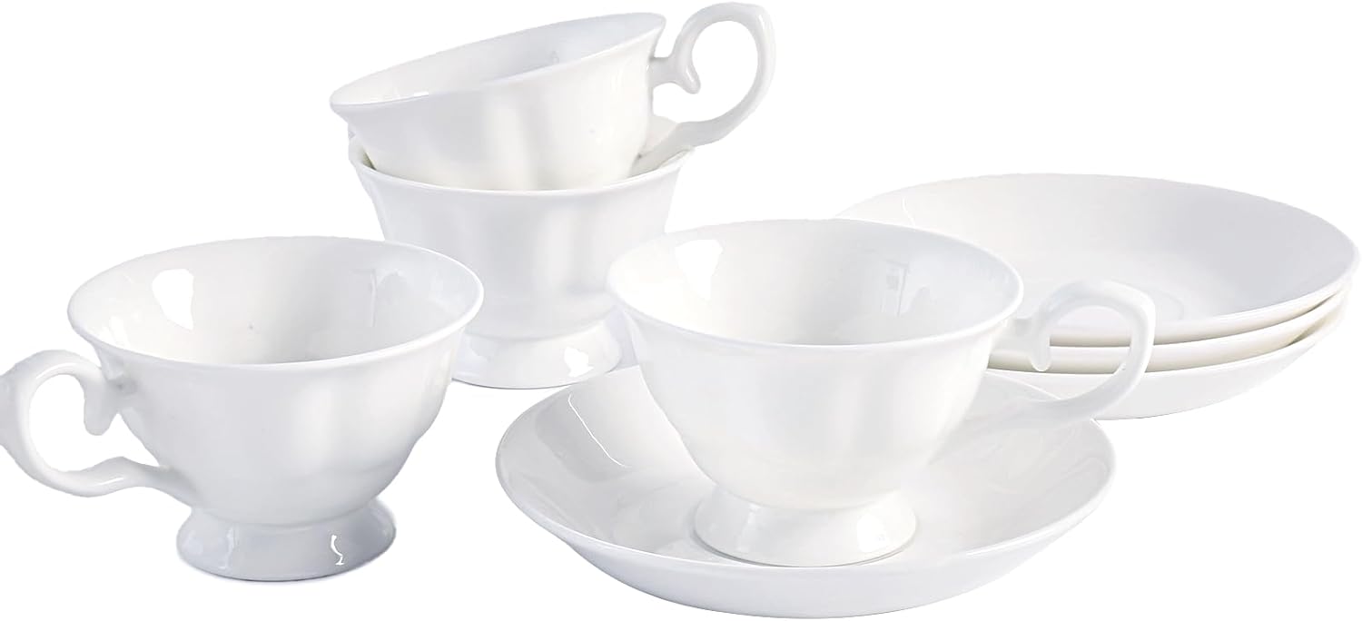 - [Royal Luxury] This tea cup set includes four elegant fine bone china 4 oz British royal-style tea cups and two matching non-slip saucers. The uniquely embossed design enhances the porcelain tea cup's noble appearance, adding a touch of sophistication and elegance. Perfect for afternoon tea, this vintage tea cup and saucer set is ideal for entertaining guests or as gifts for tea lovers