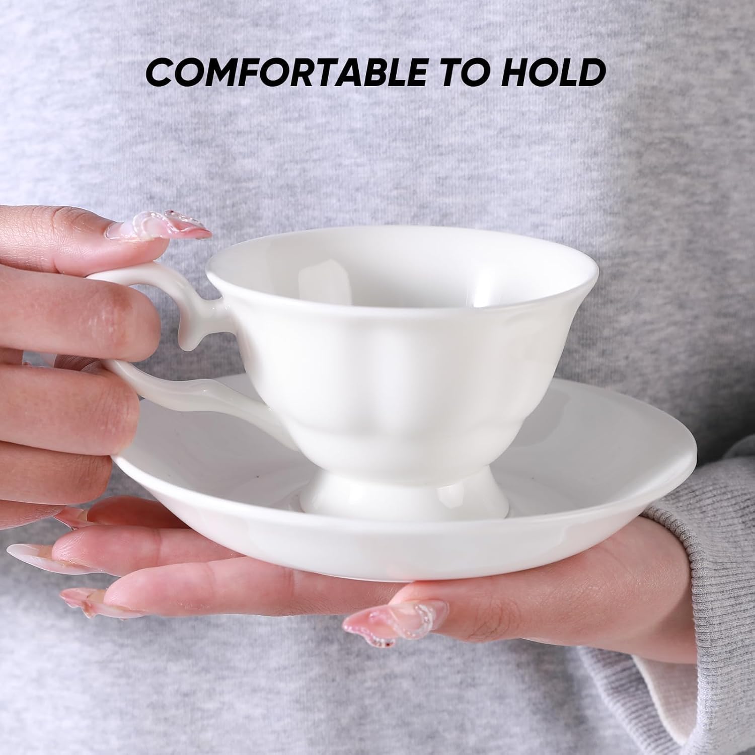 - [Royal Luxury] This tea cup set includes two elegant fine bone china 4 oz British royal-style tea cups and two matching non-slip saucers. The uniquely embossed design enhances the porcelain tea cup's noble appearance, adding a touch of sophistication and elegance. Perfect for afternoon tea, this vintage tea cup and saucer set is ideal for entertaining guests or as a gift for tea lovers