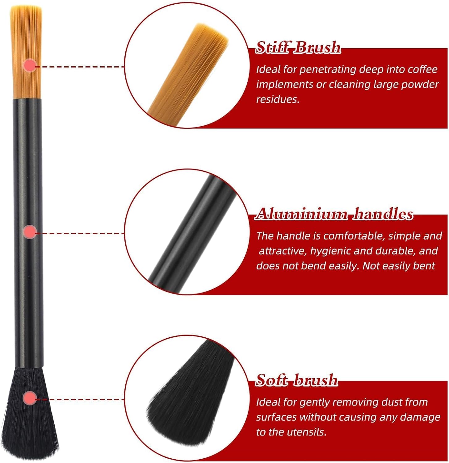 - Soft Brush Hair: Coffee grinder brush gives not too stiff or too soft, Coffee Pot Brush have just the right pliancy for a good clean coffee grounds and residue without damaging grinding equipment surfaces