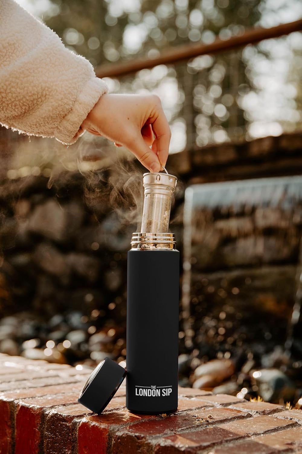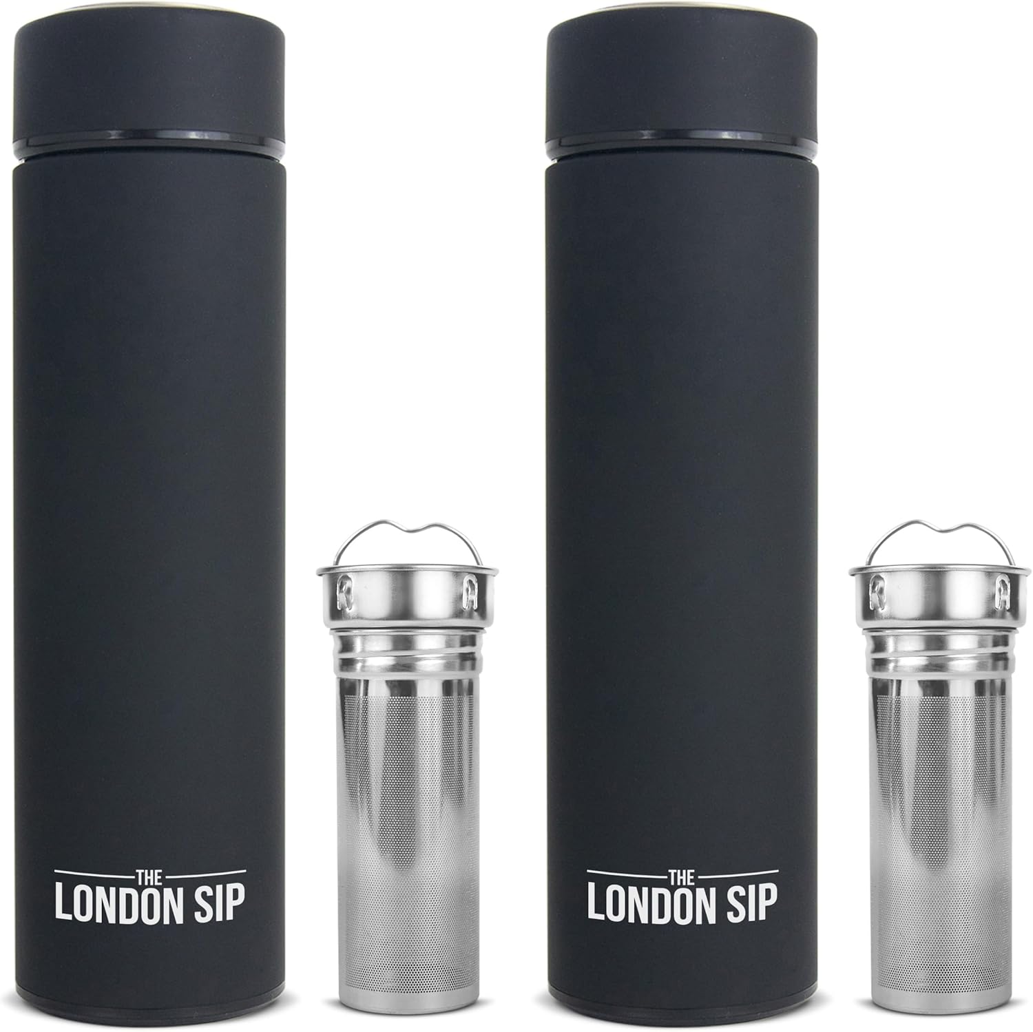 London Sip Multi-Purpose Travel Mug and Tumbler Fruit Infused Flask Hot and Cold Double Wall Stainless Steel Thermos with Extra-Long Infuser, Zen Black, Pack of 2