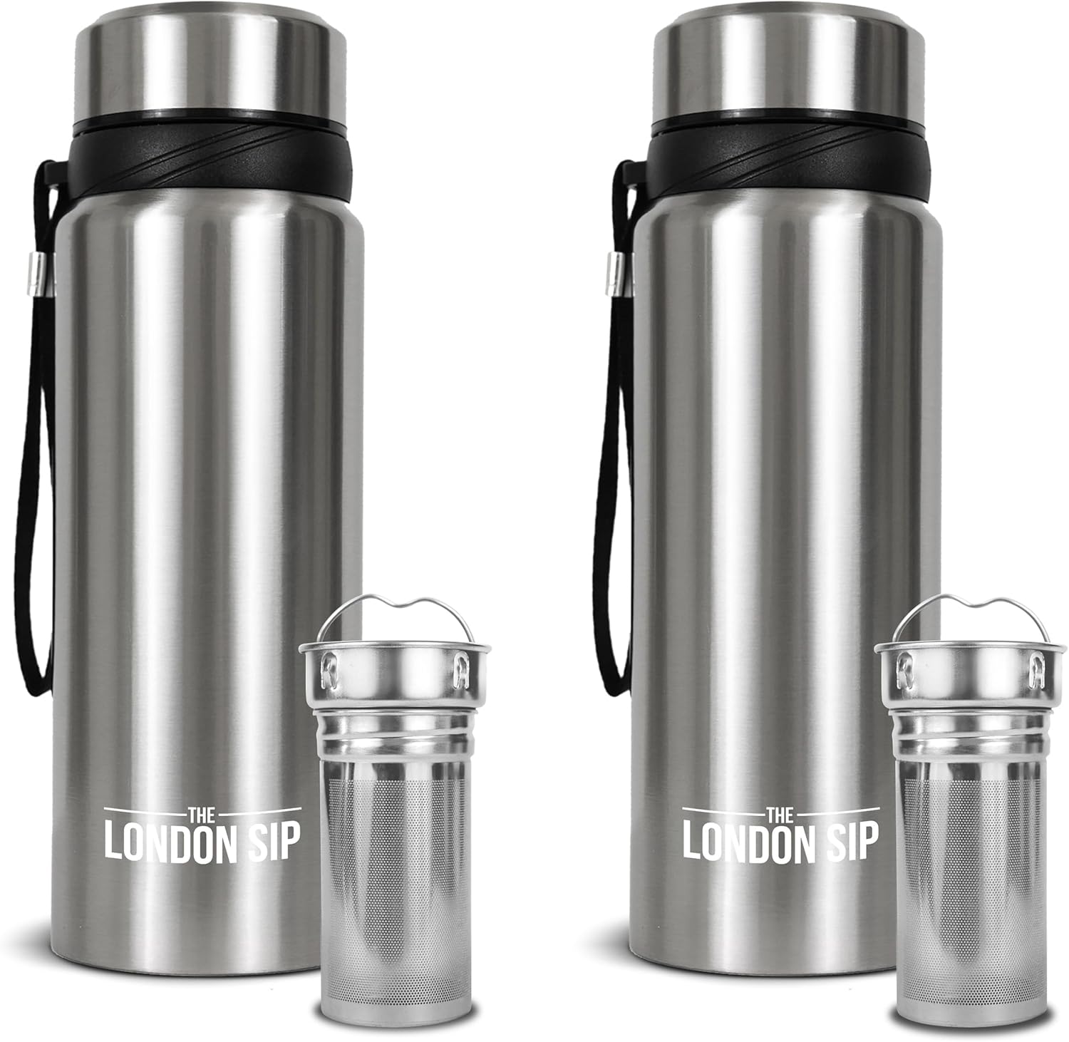 London Sip 25 oz Multi-Function Travel Mug and Tumbler Tea Infuser Water Bottle Fruit Infuser Flask Hot and Cold Double Wall Stainless Steel Coffee Thermos, Cosmic Silver, Pack of 2