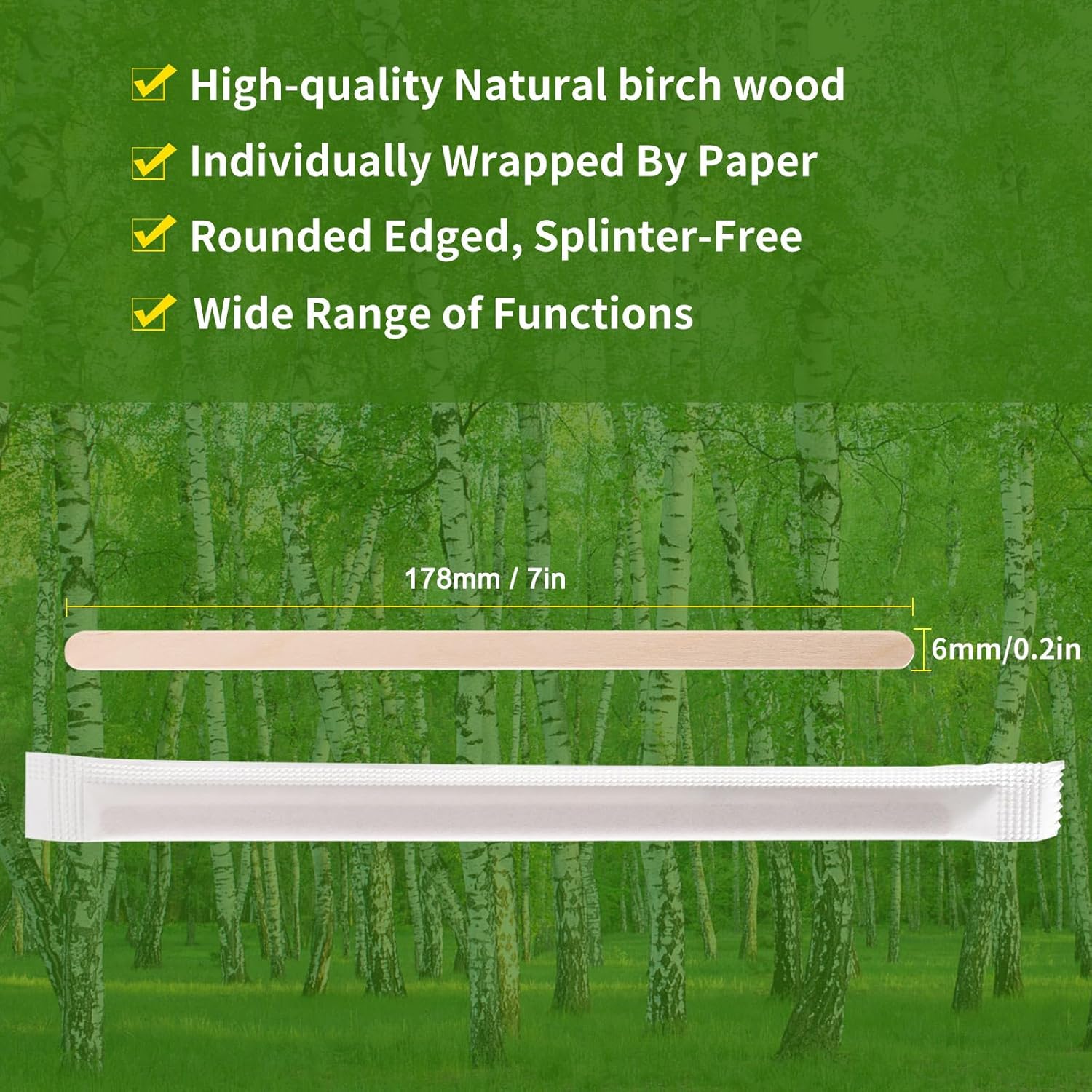 500pcs Individually Wrapped Coffee Stirrers Wood - 7" Coffee Stir Sticks, Round End Disposable coffee stirrer, For Coffee, Cocktail and Hot Drinks