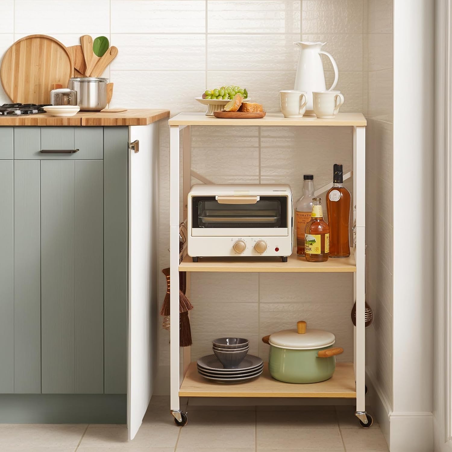 IBUYKE Kitchen Shelf Cart, 3-Tier Microwave Oven Stand, Baker’s Rack with Metal Frame and 8 Hooks, Industrial Printer Stand, Utility Standing Storage Shelf for Coffee Bar, Simple Assembly, TMJ023R