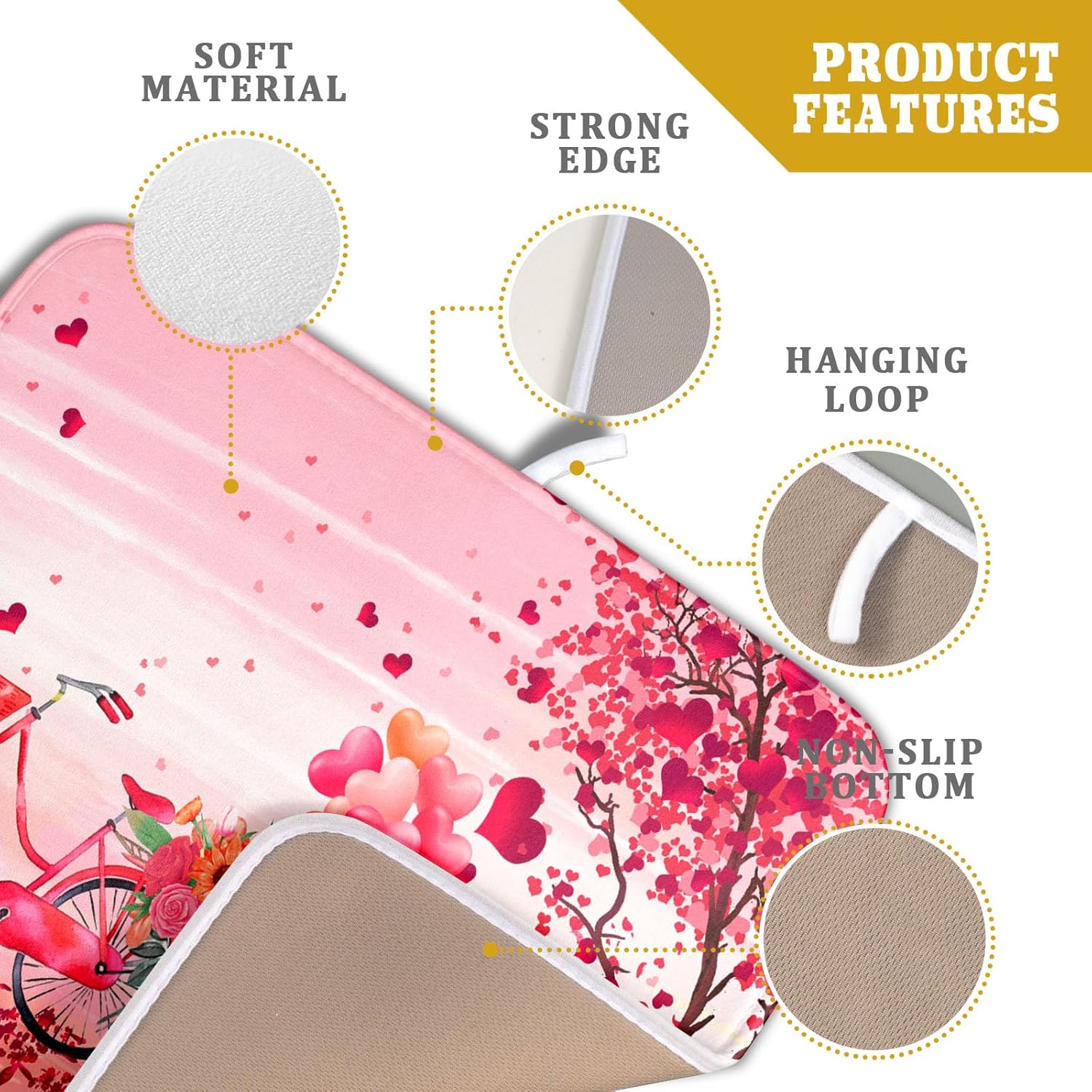 - 3【Unique Design】: Pink love tree dish mat with vibrant bicycle and gnomes patterns, which can add more love spirit to your kitchen office or coffee bar counter. The drying mat for kitchen counter with unique hanging rope design that can be hung without occupying any space,soft and foldable, easy to store.