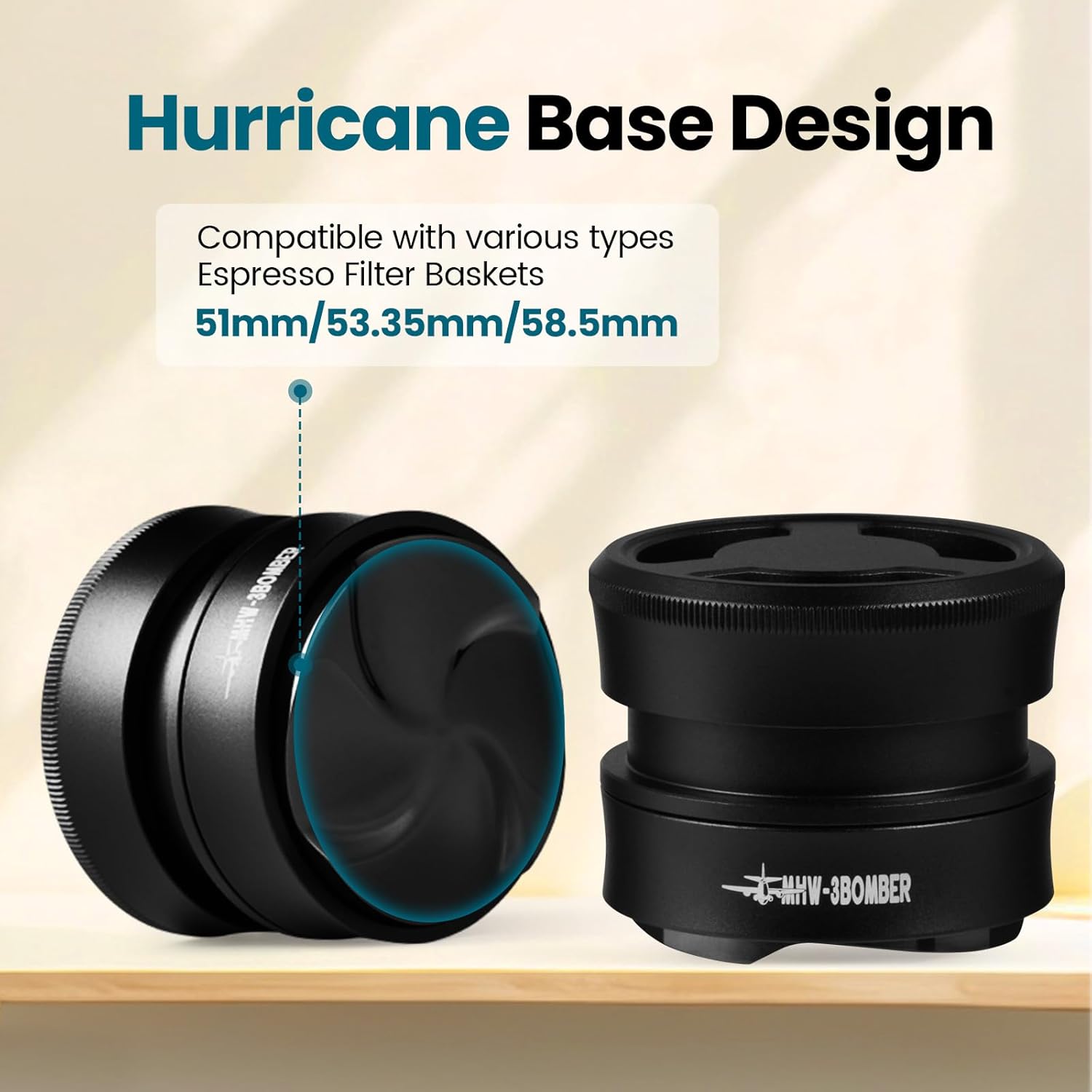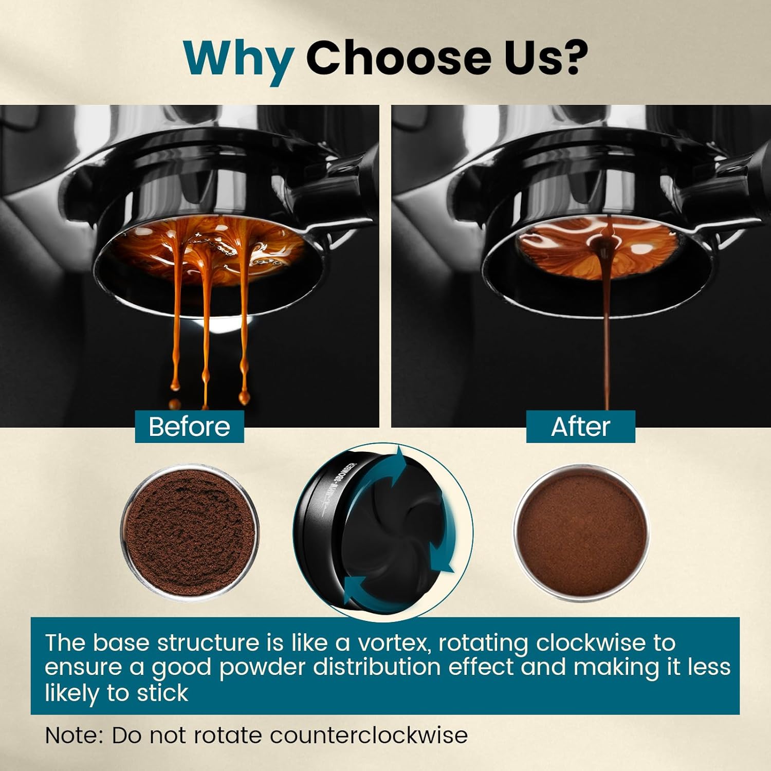 - 【Hurricane Base】The 51mm distribution tool's base design draws inspiration from a hurricane vortex, clockwise powder distribution for a more efficient process that minimizes powder clumping. Comes with a distributor silicone storage pad. Note: Rotate this distributor clockwise for powder distribution, avoid counterclockwise rotation.