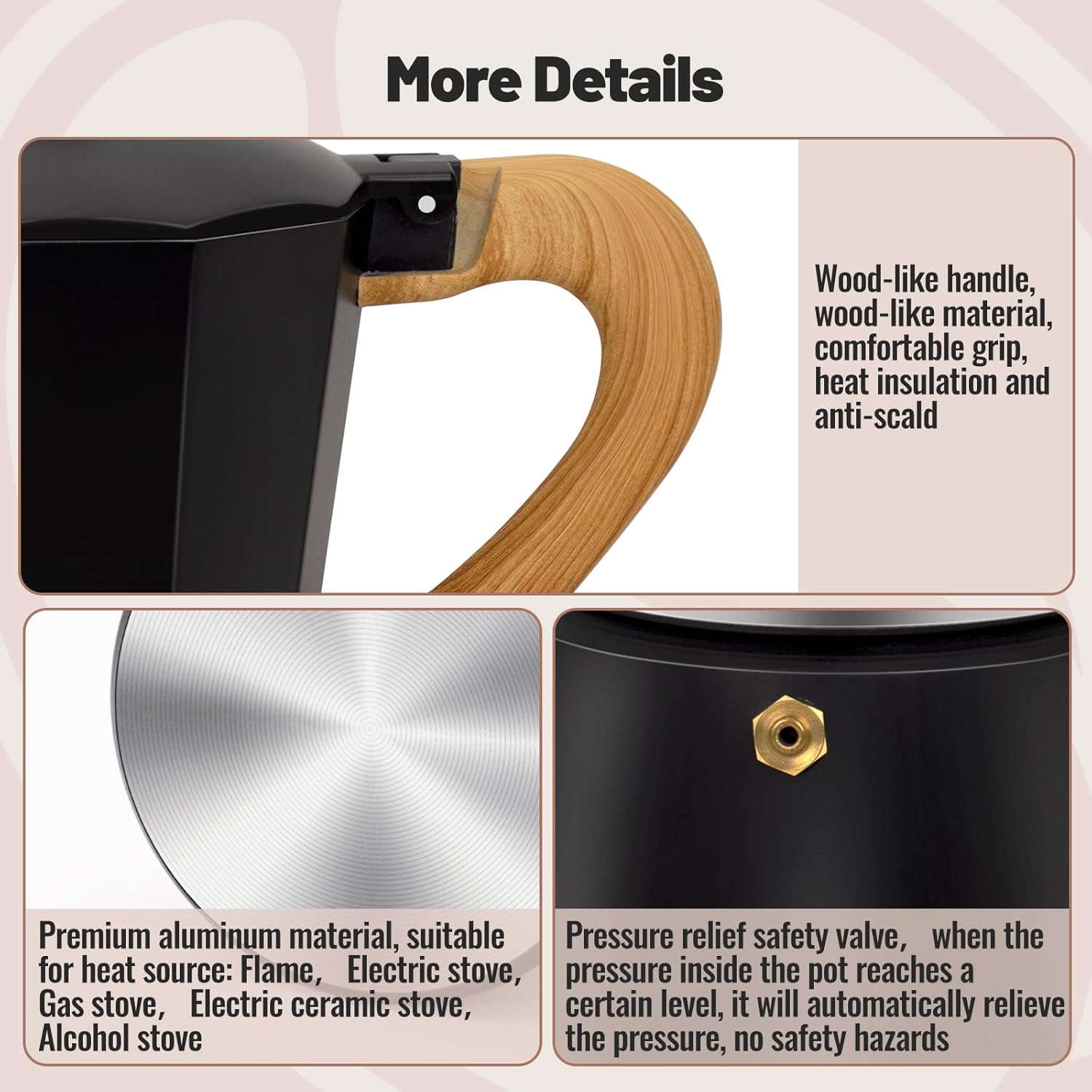 - Exquisite Taste Experience: Elevate your coffee moments with our Moka pot. It's not just about the incredible taste of your cup of coffee; it's about the whole experience. Unleash your creativity and prepare personalized, smooth, and rich brews for your loved ones, evoking elegance and style, regardless of the occasion or setting