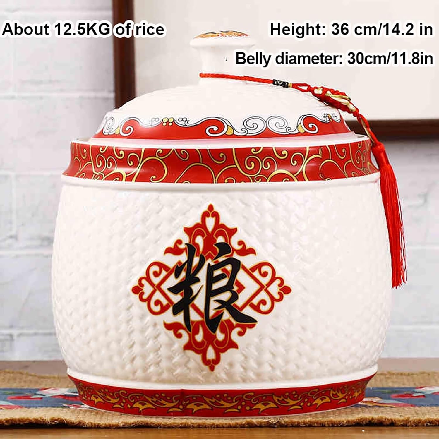 Chinese Sealed Large-Capacity Rice Pot, Ceramic Rice Bucket With Tassel Design, Grain Storage Ceramic Container, Rice Dispenser Airtight Storage Bucket For Grains Snacks Candy Coffee Beans Food(F,Capa
