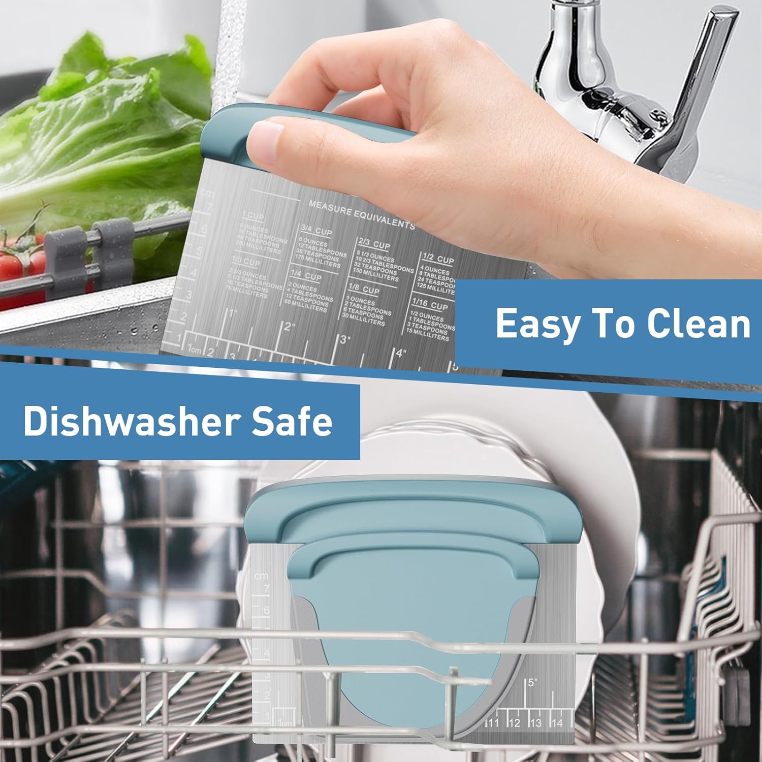 2 IN 1 Upgrade Bench Scraper, Dough Scraper for Pastry Bread Cake Pizza, Stainless Steel Dough Cutter with Conversion Chart & Measuring Scale, Bowl Scraper Food Scraper for Kitchen Baking, Blue