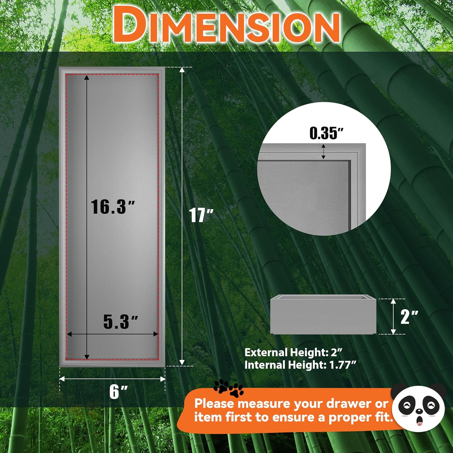 - Each bamboo drawer organizer measures: external size: 17" L x 6" W x 2" H; internal size: 16.3" L x 5.3" W x 1.77" H. Please check the size before purchasing