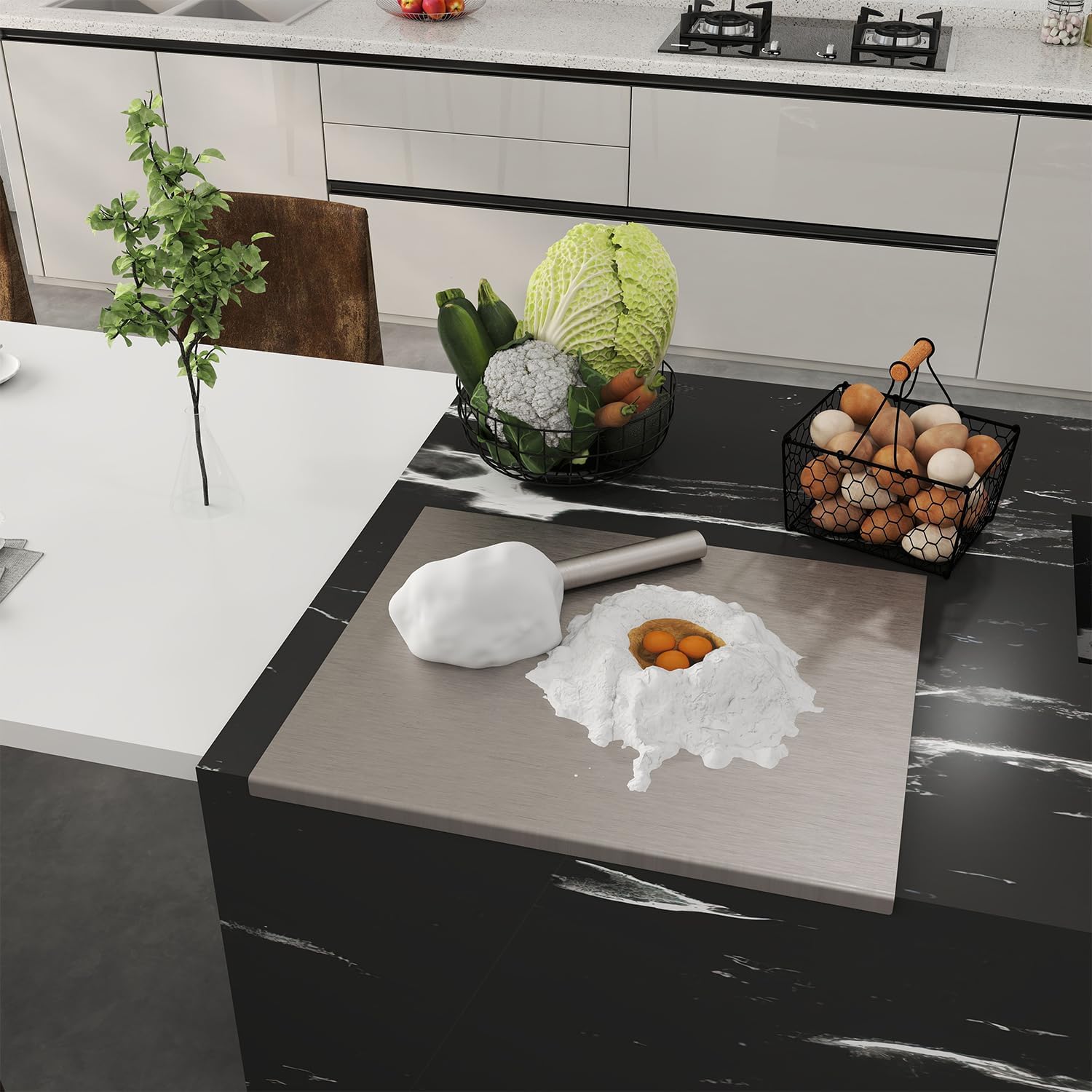 - MULTIFUNCTIONAL USE:This versatile 304 Stainless Steel Cutting Board isn’t just for chopping. It doubles as an excellent surface for rolling dough, perfect for making bread, pastries, cookies, and pizza. The sturdy steel construction also allows it to handle heavy-duty tasks like chopping meat or slicing cheese without warping. Whether you're preparing vegetables, kneading dough, or carving a roast, this cutting board is a must-have tool for your kitchen, ensuring you can tackle a wide range of culinary projects with ease.